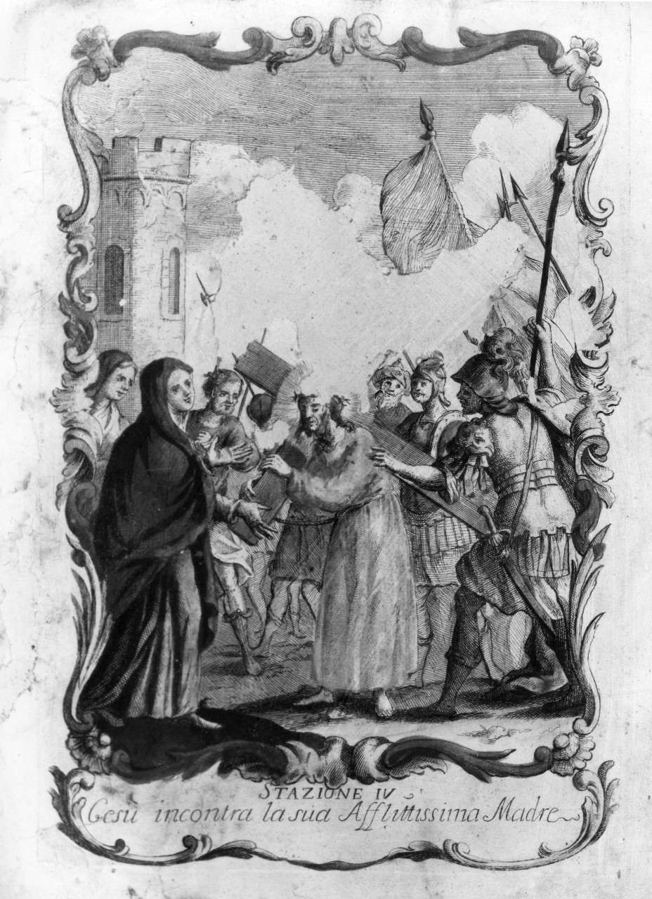 - ISCRIZIONI in basso - STAZIONE IV / GESU' INCONTRA LA SUA AFFLITTISSIMA MADRE - corsivo -