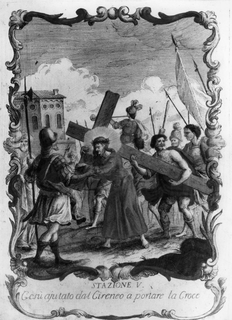 - ISCRIZIONI in basso - STAZIONE V / AIUTATO DAL CIRENEO A PORTARE LA CROCE - corsivo -