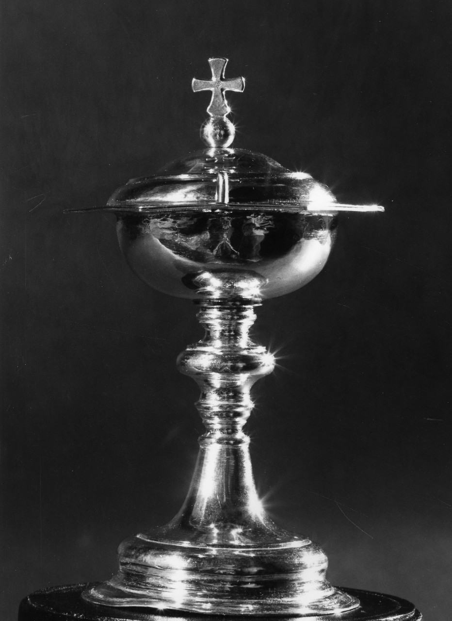Pisside in lamina d'argento con piede bombato con cornice modanata. Nodo a rocchi sovrapposti, bordi della coppa e del coperchio esagonali con cerniera e pernetto. Il coperchio sagomato culmina con globo e crocetta apicale