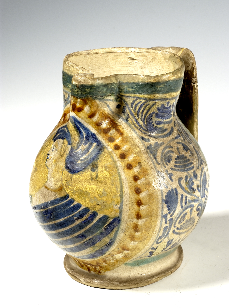 - NOTIZIE STORICO CRITICHE Appartiene molto probabilmente alla produzione faentina della metà del secolo XVI. Un boccale molto simile ma dipinto in modo più raffinato è illustrato in Liverani e Bosi e risale alla fine del Quattrocento. La serie delle "belle" in fogge ed esecuzioni svariate è comune a Faenza fin dal primo Cinquecento e si mantiene a lungo. Il boccale è stato recentemente (2015) attribuito alla manifattura romana, accostandosi a numerosi rinvenimenti archelogici in area romana