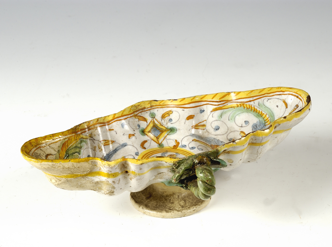 Salsierina a navicella, di forma allungata e sbaccellata; manici a tortiglione desinenti a foglia; piccolo piede rifatto; decorazione a grottesche con moivi alternati di arpie e losanghe; al centro in triplice banda medaglione circolare contenente insetto alato; orlo sotolineato da banda cordonata giallo ocra; retro in smalto bianco e bordura gialla; colori: verde, giallo, ocra, arancio, azzurro, tratti bruni