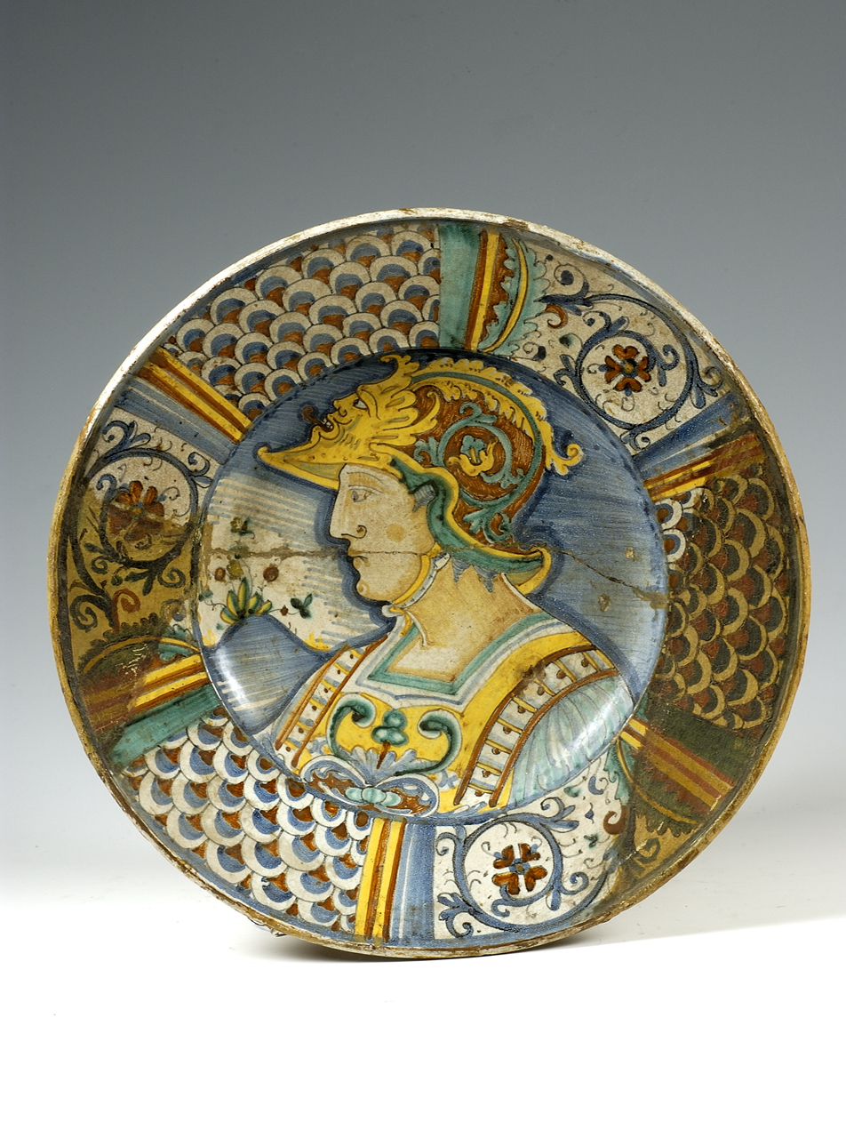 Grande piatto a larga tesa decorato al centro dal busto di tre quarti e di profilo volto a sinistra di un guerriero con elmo ed armatura; sulla tesa divisa a scomparti si alternano girali fioriti e il classico motivo a embricazioni; colori: due toni di azzurro, giallo, verde e arancio