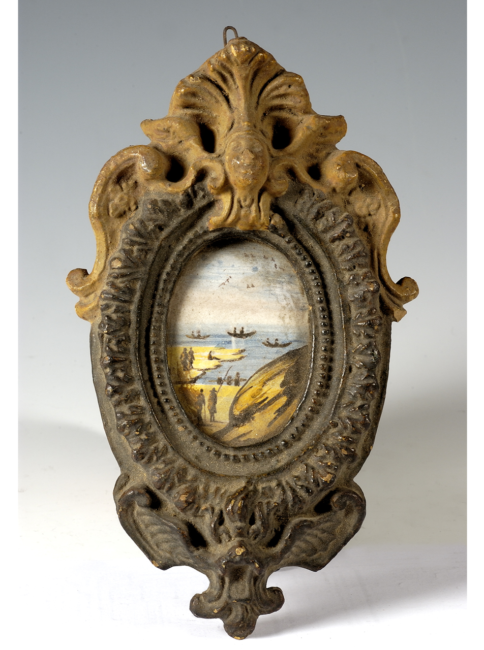 Placchetta ovale decorata con un alto scoglio a destra su uno sfondo marino con barche e uomini a riva; colori giallo, azzurro, arancione e bruno; cornice in terracotta grezza parzialmente patinata a finto bronzo ornata da rilievi