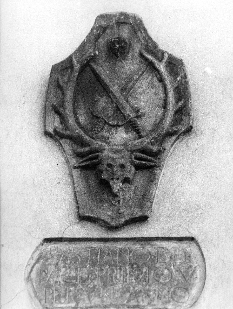 - STEMMI parete - gentilizio - Stemma - Del Pace - L'arme della famiglia Del Pace consistente in teschio di cervo con corna in piede e campo, spade incrociate in corpo, piccolo scudo in testa. Ha forma di testa di cavallo elaborata e incorniciata da una lista a bassorilievo