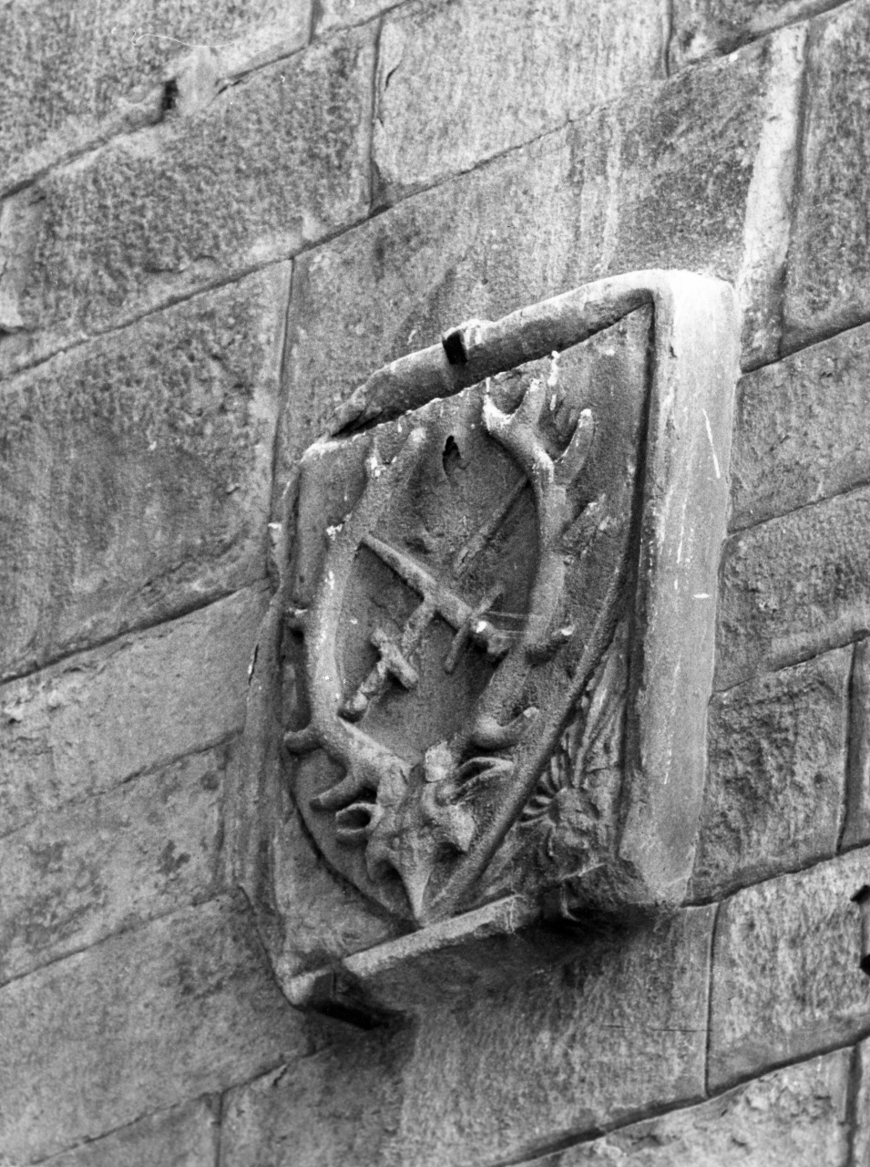 - STEMMI facciata - gentilizio - Stemma - Lo stemma è a forma di scudo appuntito e l'arme consiste in corna di cervo che sormontano un cranio e incorniciano due spade incrociate in corpo