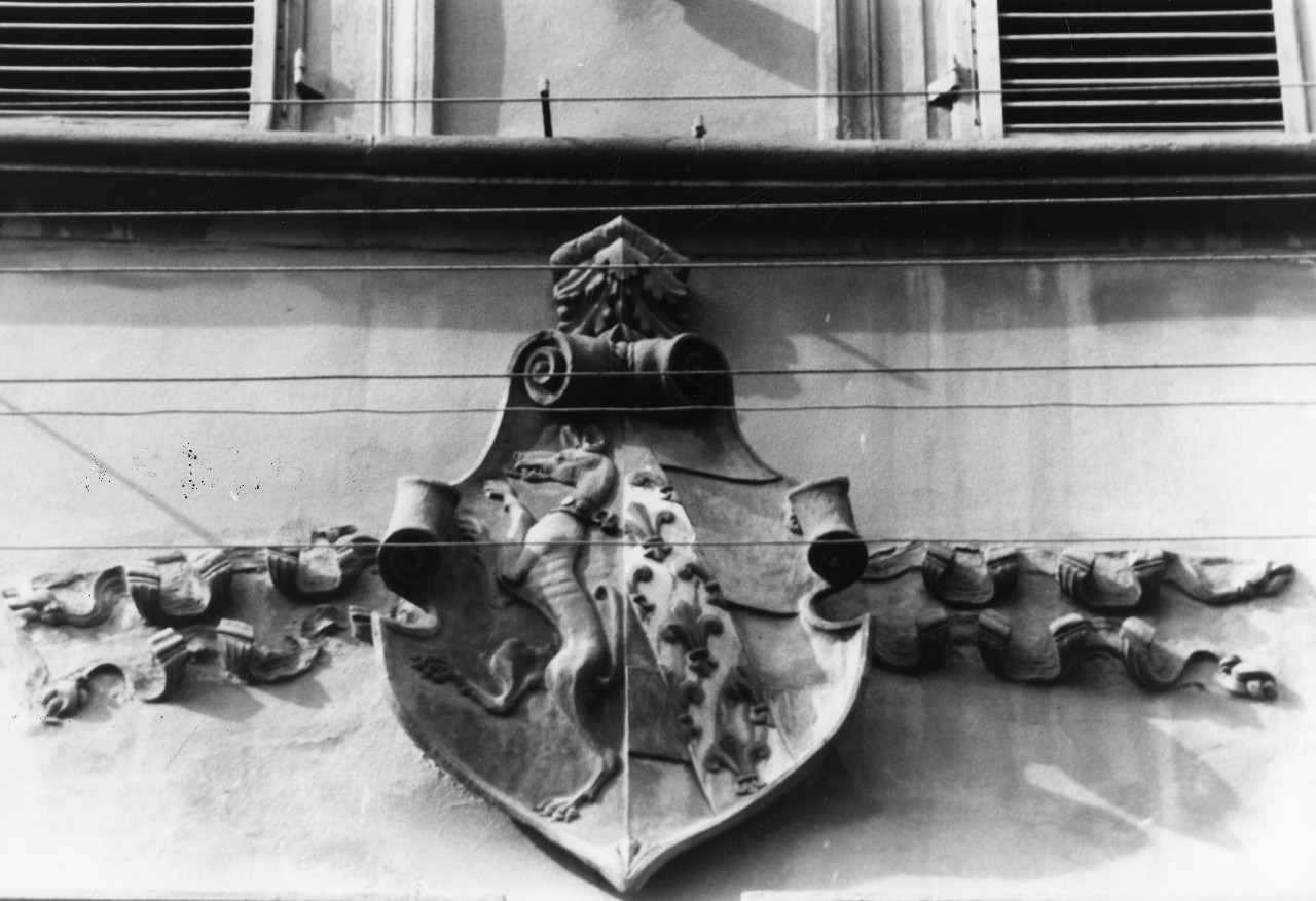 - STEMMI facciata - gentilizio - Stemma - L'arme consiste in campo partito con levriero rampante in fianco destro e fianco sinistro in pezza gagliarda e banda portante gigli. La banda è dipinta di bianco i gigli in oro