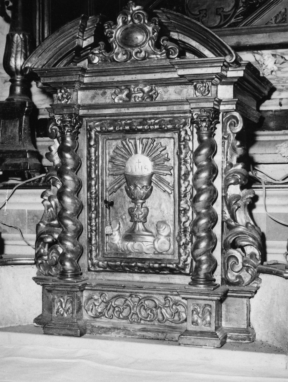Piccolo ciborio in legno intagliato e dorato, con il timpano spezzato e cartella in alto, due colonnine tortili ai lati dello sportellino e, raffigurato sul medesimo il calice con l'ostia