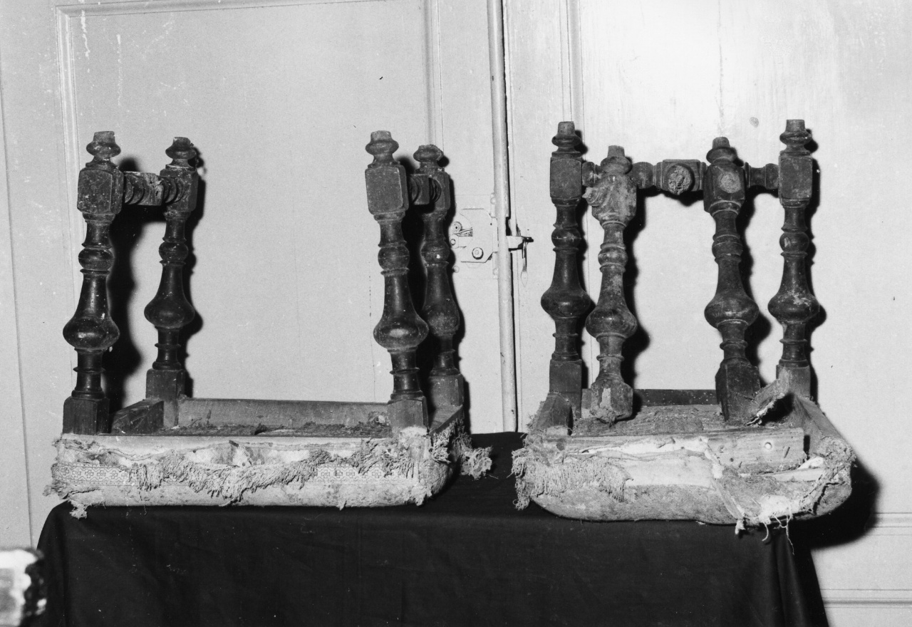 Sgabello in legno di noce con gambe tornite, al centro nodo piriforme. La tappezzeria in pessimo stato, come del resto l'imbottitura in damasco