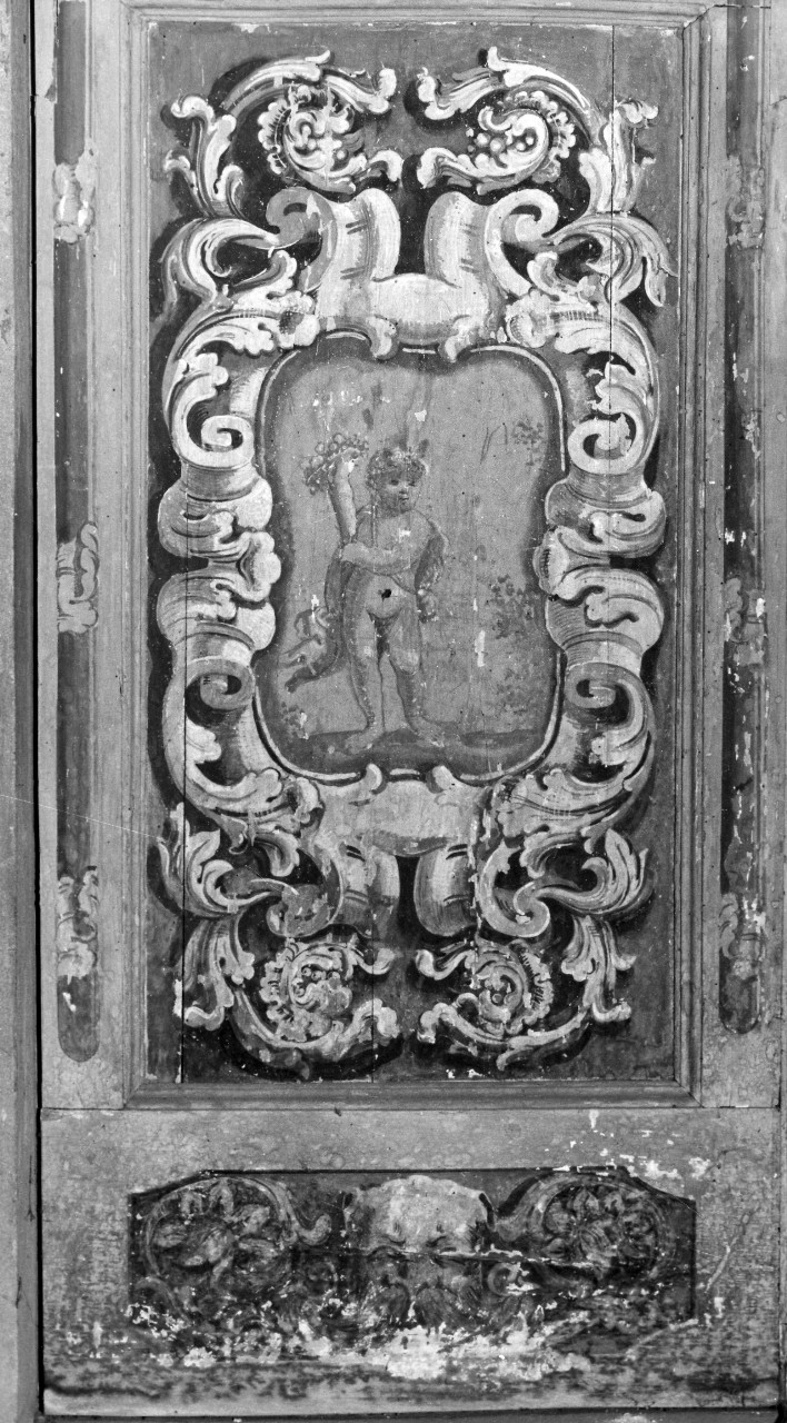 Porta di legno a due battenti, diviso ognuno in due pannelli rettangolari, in cui è dipinta una grossa cornice a monocromo grigio e nel centro una scena figurata a monocromo dorato