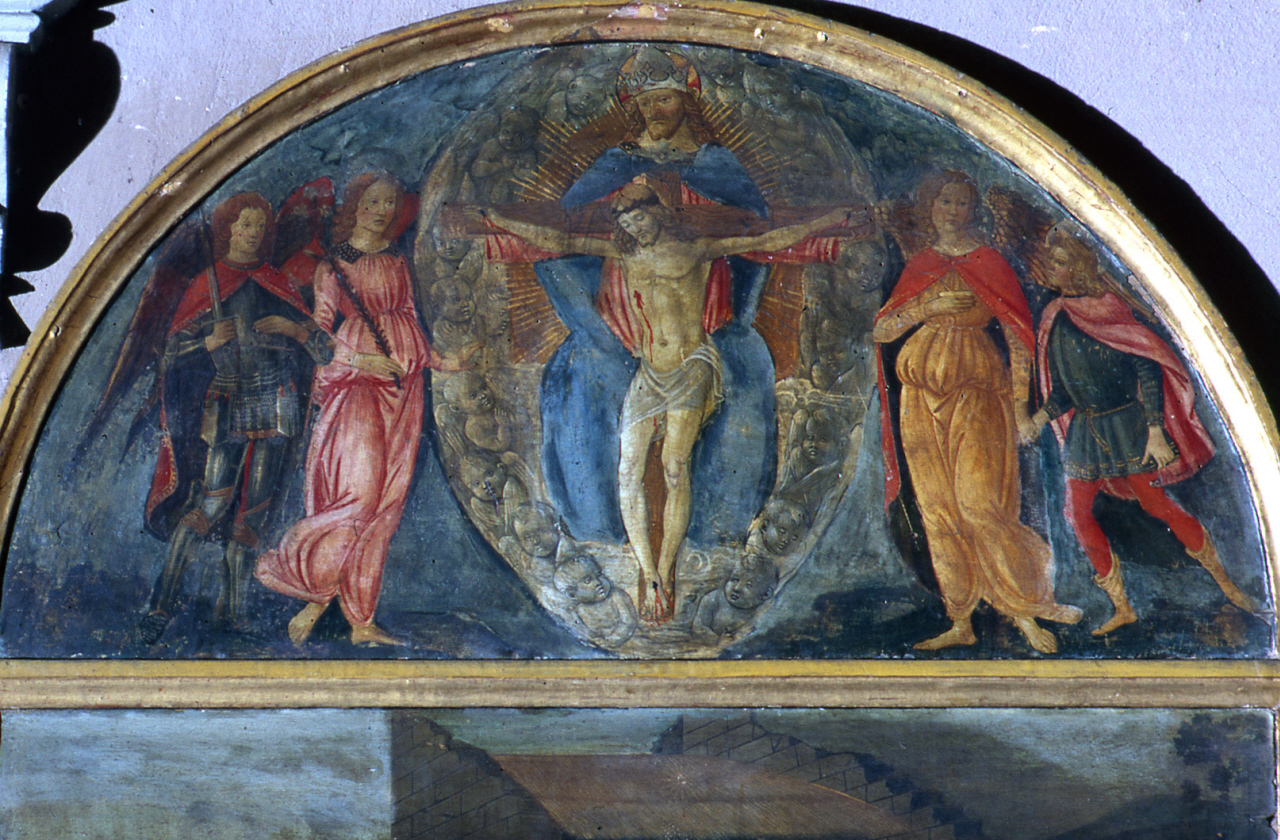 Personaggi: Dio Padre; Cristo; San Michele arcangelo; San Gabriele arcangelo; San Raffaele arcangelo; Tobiolo. Abbigliamento: all'antica; contemporaneo. Figure: cherubini. Simboli: colomba dello Spirito Santo