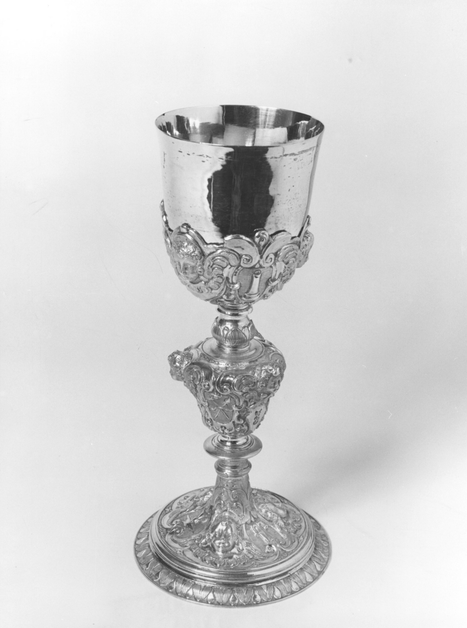 Il calice ha una base circolare sulla quale, entro tre cartigli, sono raffigurati i simboli della Passione: bacile, brocca - tunica - velo della Veronica; una testa alata di cherubino, in rilievo, divide i cartigli. La stessa decorazione si ripete nel nodo con simboli diversi: lancia e spugna - tre chiodi - martello e tenaglie; nella sottocoppa: corona di spine - colonna - dadi
