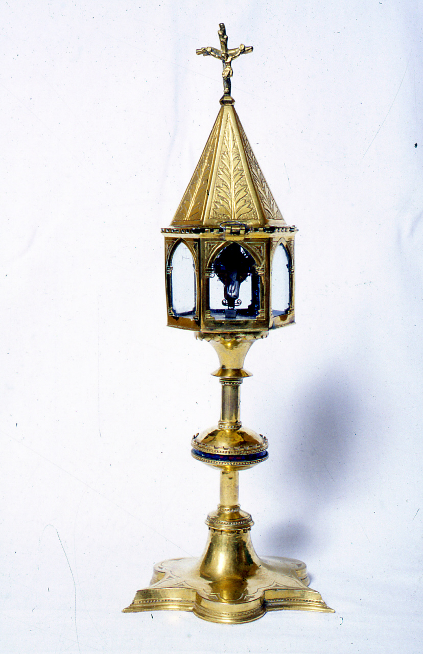 Reliquiario con base polilobata che sostiene un fusto con nodo a cipolla decorato da smalti rossi su fondo nero. La teca di forma esagonale, reca gli sportelli cuspidati con ai lati decorazioni di colonne; la cuspide porta incisa su ogni faccia una foglia d'acanto. Al vertice vi è una crocetta con i bracci a forma di tronco ed il Cristo. Alla base è stata tagliata la punta fra i due lobi