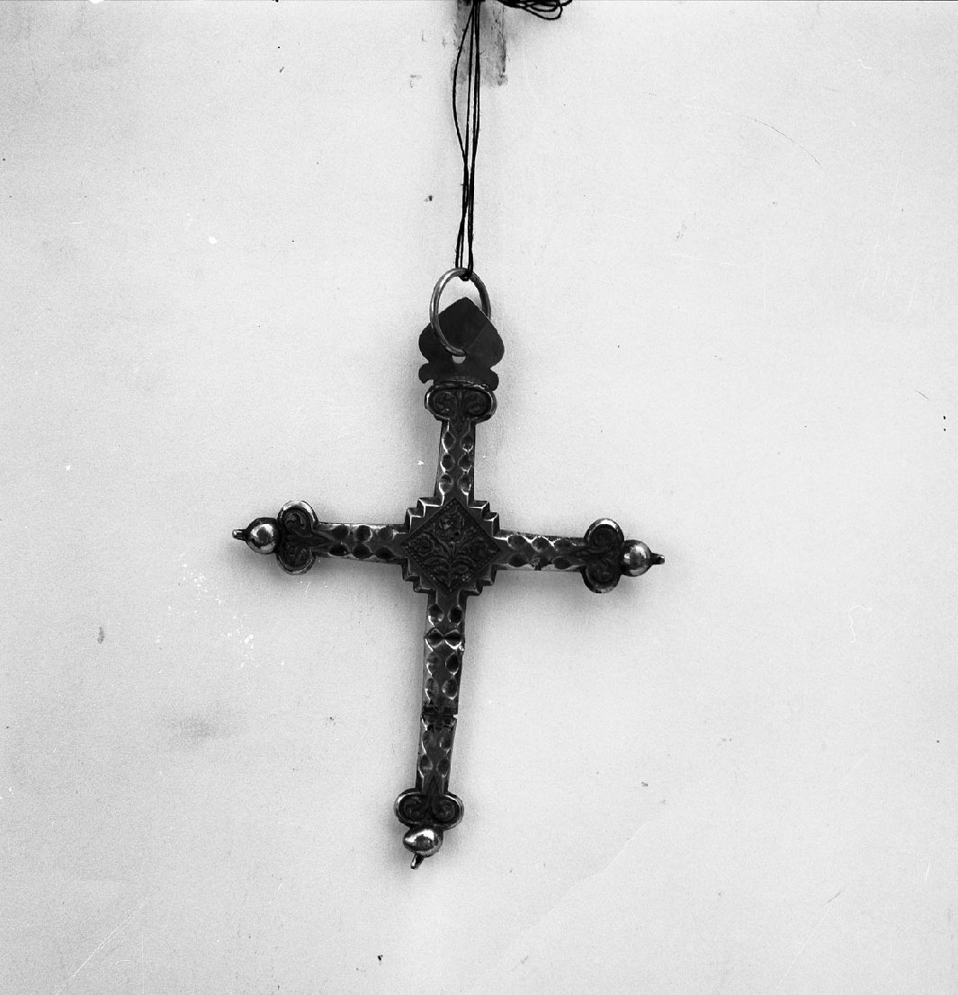La croce è interamente lavorata a sbalzo a motivo di piccoli incavi regolari; all'icrocio dei bracci vi è un medaglione romboindale ornato da un rametto con tre rose; terminali bilobati, decorati con una pigna e un motivo cesellato a doppio girale vegetale. In alto manca la pigna, sostituita da un sostegno sagomato attraverso il quale passa un anello