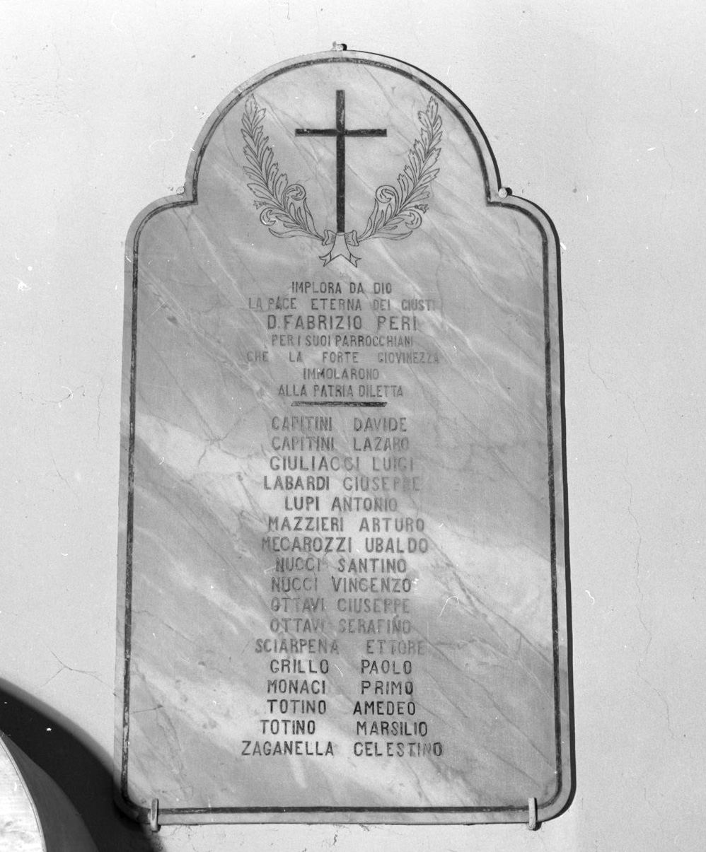 - ISCRIZIONI a tutto campo - IMPLORA DA DIO/ LA PACE ETERNA DEI GIUSTI/ D(ON) FABRIZIO PERI/ PER I SUOI PARROCCHIANI/ CHE LA FORTE GIOVINEZZA/ IMMOLARONO/ ALLA PATRIA DILETTA/ CAPITINI DAVIDE/ CAPITINI LAZARO/ GIULIACCI LUIGI/ LABARDI GIUSEPPE/ LUPI ANTONIO/ MAZZIERI ARTURO/ MECAROZZI UBALDO/ NUCCI SANTINO/ NUCCI VINCENZO/ OTTAVI GIUSEPPE/ OTTAVI SERAFINO/ SCIARPENA ETTORE/ GRILLO PAOLO/ MONACI PRIMO/ TOTINO AMEDEO/ TOTINO MARSILIO/ ZAGANELLA CELESTINO - lettere capitali -