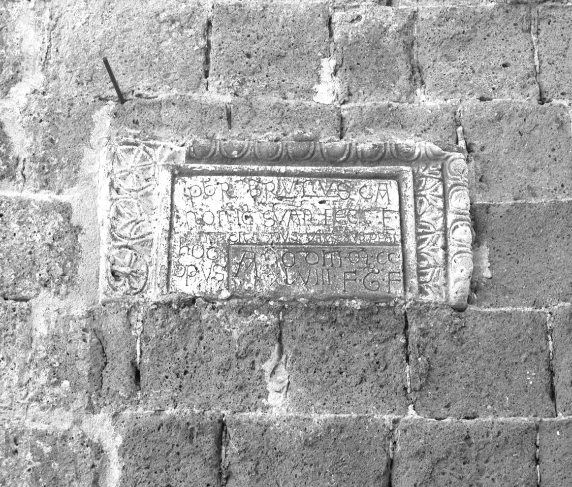 - NOTIZIE STORICO CRITICHE Questa lapide documenta il restauro della cattedrale e la costruzione di contrafforti laterali, fatti eseguire nel 1248 dal prete Bruno, con la collaborazione economica di un cittadino di Sovana, come si può leggere nella parte inferiore della targa, che è composta da due lastre accostate