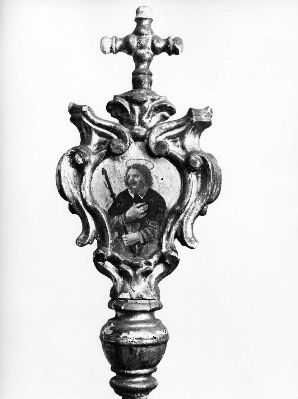 Bastoni processionali in legno dorato e argentato; sulle facce della cuspide, da un lato è dipinto San Rocco a mezzobusto, e dall'altro è dipinto il monogramma mariano