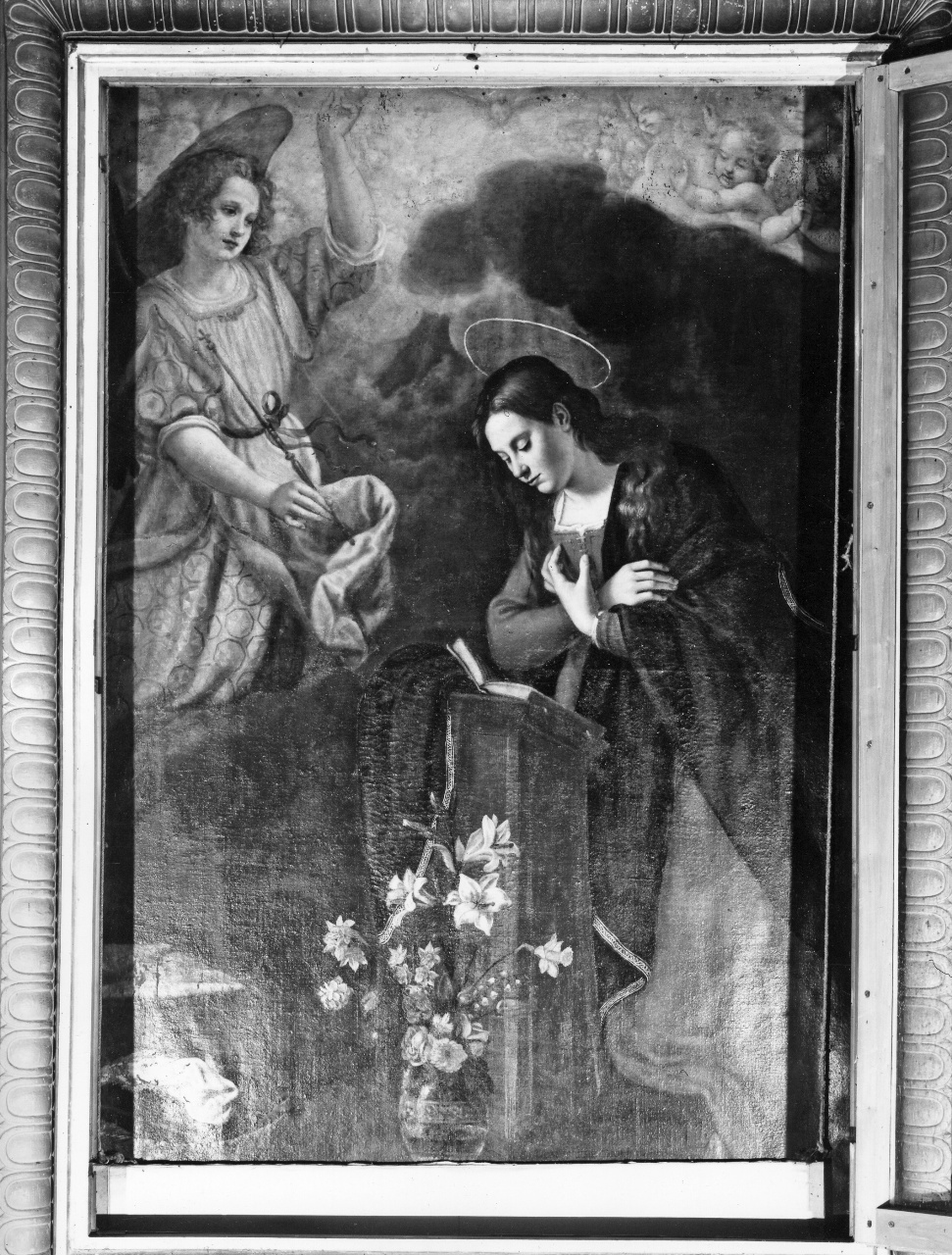Personaggi: Madonna; San Arcangelo Gabriele. Simboli: (Spirito Santo) colomba. Figure: angeli; cherubini. Oggetti: inginocchiatoio; libro; vaso di fiori