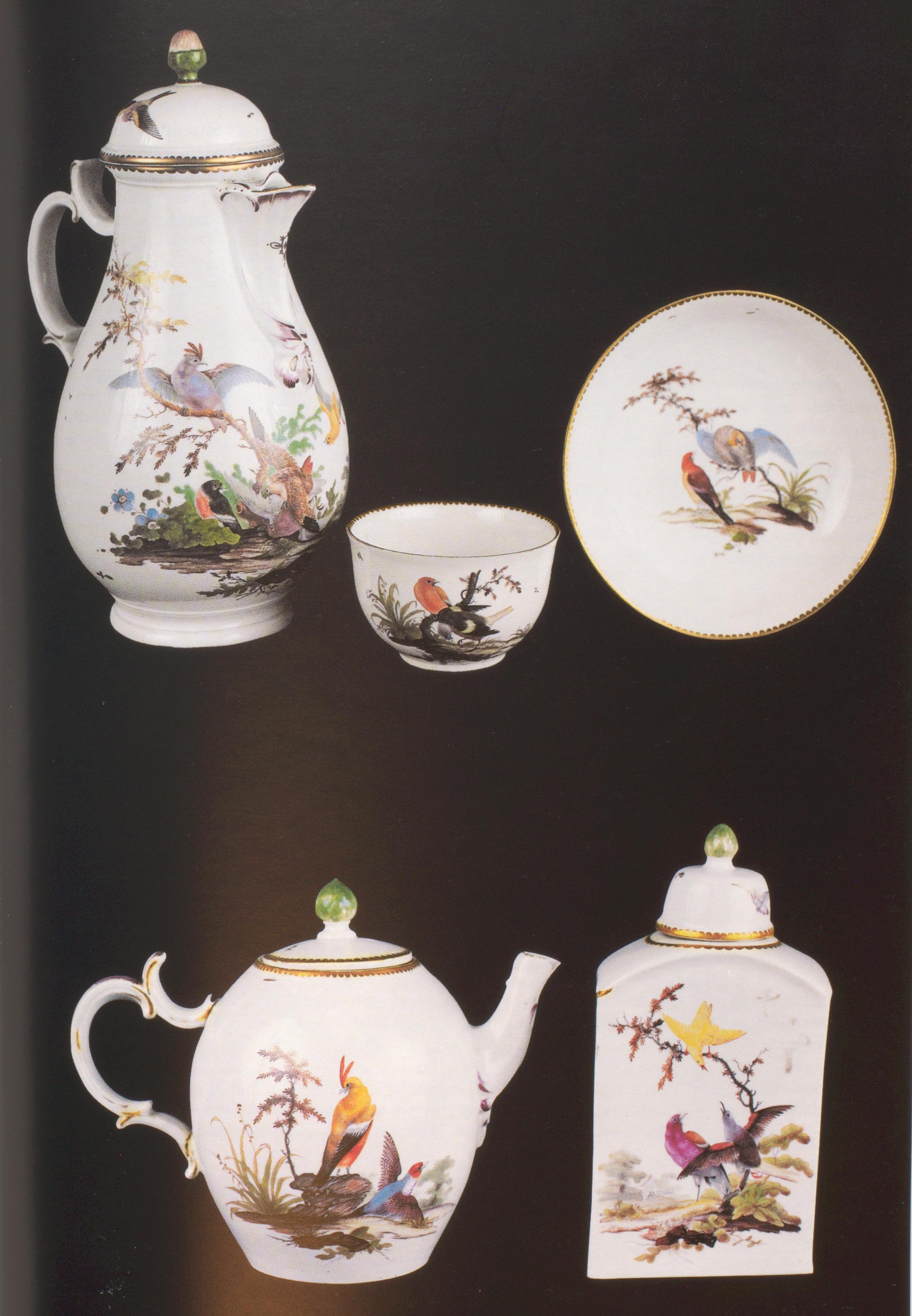 - NOTIZIE STORICO CRITICHE Il decoro con uccelli immersi nella natura è da ritenersi una sintesi di due fonti menzionate nei tariffari della manifattura. Si tratta del "Natürliche bunte Vogel" e del "Japanische Bunte Vogel und Gold". Il numero "2" impressi sotto al piede di alcuni elementi del servizio è da riferire a esemplari con decori pregiati, mentre la "B" è da ricondurre al tornitore Nikolaus Blauner