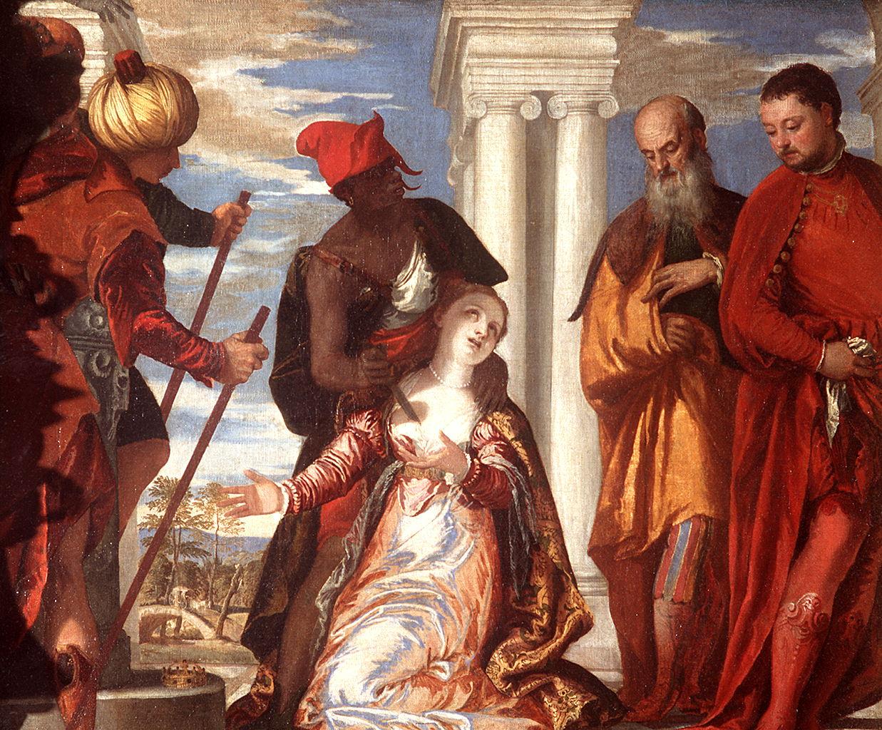 - NOTIZIE STORICO CRITICHE Il dipinto è probabilemente da identificare con quello citato nella raccolta di R. Canonici a Ferrara (Pallucchini, 1939), da dove poi sarebbe giunta in possesso di Paolo del Sera. Il quadro appartiene alla fase del pittore in cui sono presenti importanti e sontuose suggestioni coloristiche, unite ad un raffinato senso teatrale, caratteri che ne fanno uno dei più alti lavori del Veronese, fugando ogni dubbio circa l'autografia, più volte messa in dubbio in passato, la cronologia del dipinto è stata ripetutamente dibattuta ed oscilla nell'arco di un quindicennio. Il recentissimo restauro che ha interessato l'opera ne ha rimesso in luce la splendida tessitura pittorica