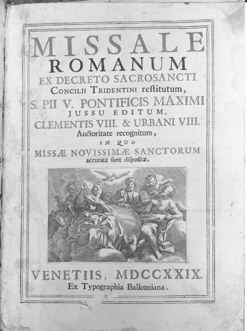 - NOTIZIE STORICO CRITICHE La stampa fa parte di un messale romano rilegato in cuoio impresso in oro con un'unica inzione nel frontespizio. Il messale è mutilo (mancano le pg. 177-256) fu eseguito a Venezia nel 1729 e la piccola incisione del frontespizio mostra le iniziale dell'autrice, suor Isabella monaca del convento di S. Croce a Venezia