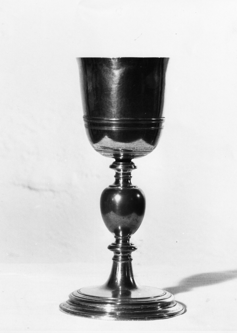 Calice in rame argentato e dorato all'interno della coppa. Privo di decorazioni, presenza base circolare gradinata, fusto diritto con nodo ovoidale, sotto coppa percorso da profilature incise perimetrali
