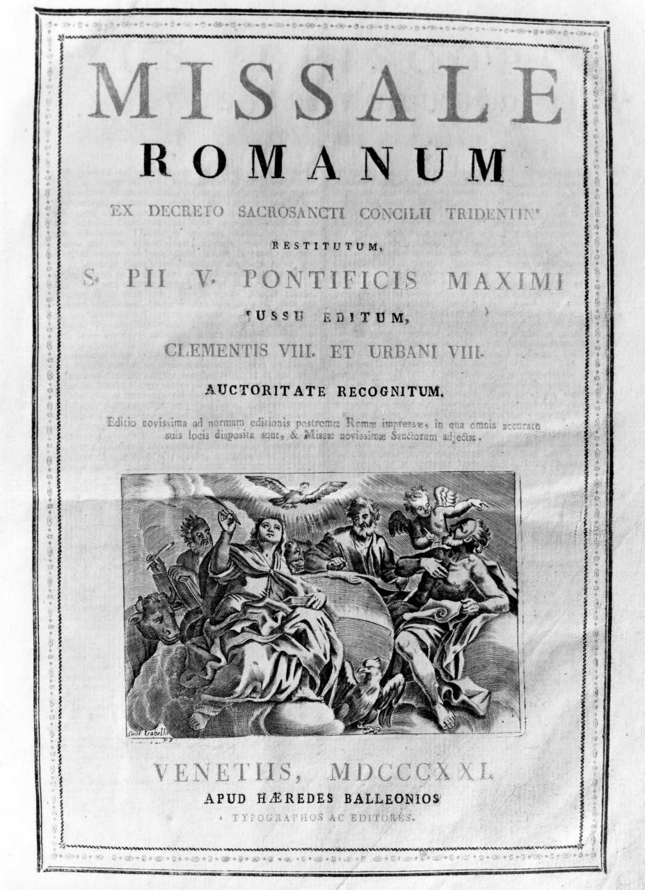 - NOTIZIE STORICO CRITICHE Il messale presenta nei suoi caratteri a stampa tutte quelle che sono le caratteristiche dell'arte tipografa veneziana dell'ottocento. Di particolare interesse è l'incisione tardo seicentesca del frontespizio eseguito utilizzando un vecchio clichè di Suor Isabella, una suora attiva nella città lagunare nella seconda metà del XVII secolo e autrice di molte opere a stampa di soggetto religioso
