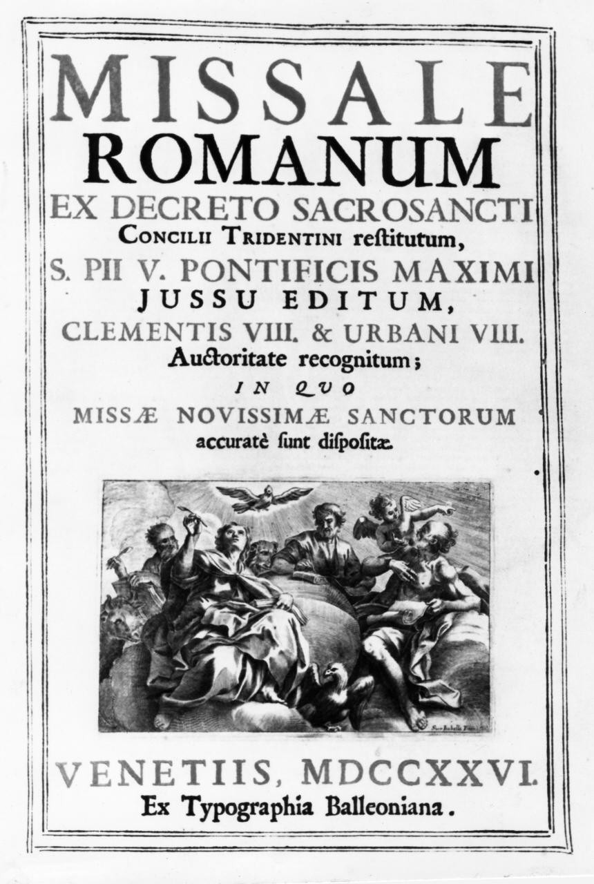 - NOTIZIE STORICO CRITICHE Messale romano stampato a Venezia presso la tipografia Balleoniana nel 1726; il frontespizio è dovuto a Isabella Piccinii, veneziana, religiosa nel convento di Santa Croce della città natale e molto attiva come creatrice di frontespizi figurati e ornamentali per libri sacri. Il Thieme- Becker (vol. XXVI, 1932, p. 581) la registra attitva fra il 1665 e il 1692