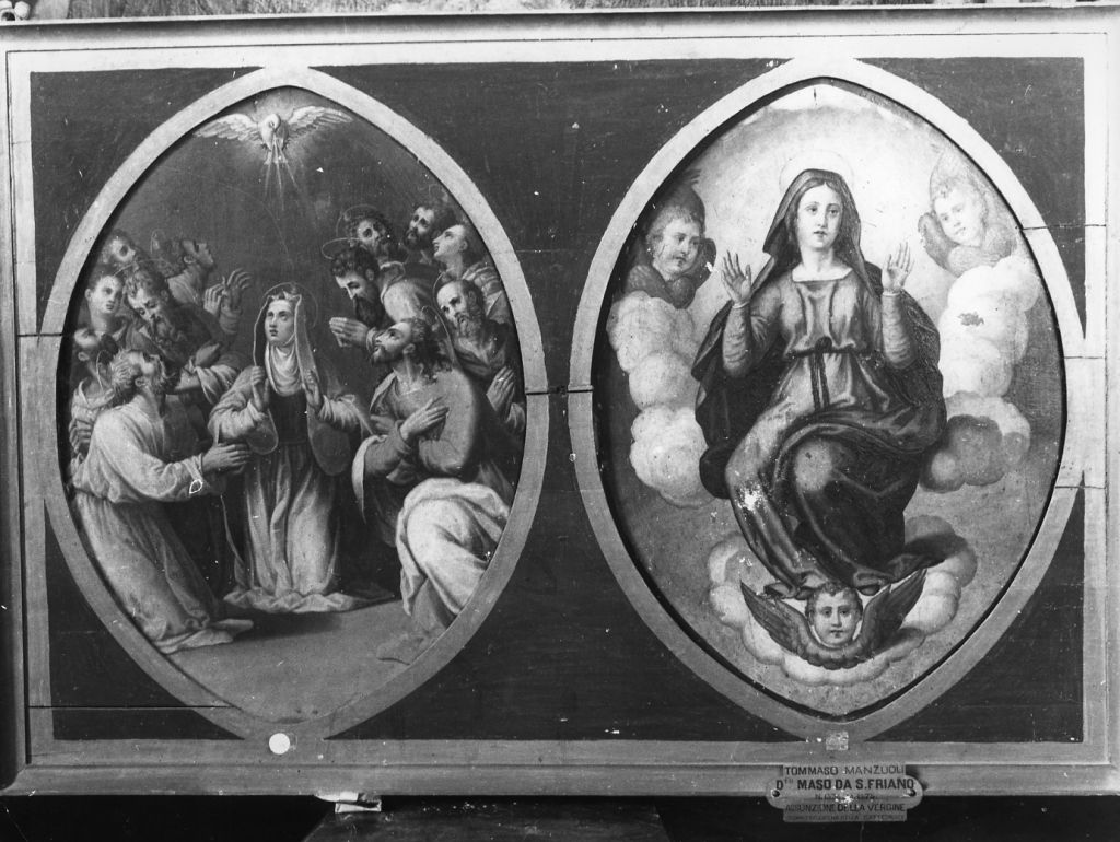 - NOTIZIE STORICO CRITICHE L'ovale fa parte di una serie di quattro dipinti di non elevata qualità e pressocchèsconosciuti, inclusi originariamente in un ornato di legno intagliato e dorato.Come riporta il Giachi (1786), essi servivano da ornamento per un frontespizioin legno intagliato e dorato, eseguito nel 1524, che fungeva da ingrandimentodell'altare maggiore nelle diverse solennità dell'anno. Il Leoncini (1869) notache questo ornato si trovava appeso in fondo al duomo e fu poi ceduto al propostodi Roncolla, mentre i dipinti, come afferma il Cinci (1885), si conservavanonella Cappella di S. Carlo della Cattedrale. Parlando dell'autore il Venturi(1932) osserva che il soprannome "da S. Friano" gli viene dal borgo di S. Fredianoin Firenze, dove era nato e, a proposito delle sue pitture, le trova caratterizzateda forme dure e legnose, accompagnate da fosche ombre. La qualità dell'Assunzioneè scarsa e pare della stessa mano del S. Giusto e del S. Vittore