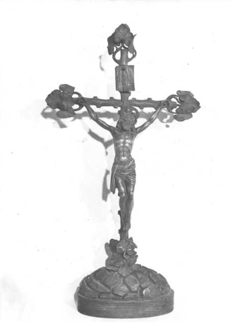 base tonda con monticello di sassi soronato da viluppo di foglie su cui si innesta braccio a ronco d'albero. terminali a viluppo di foglie. Cristo a tutto tondo
