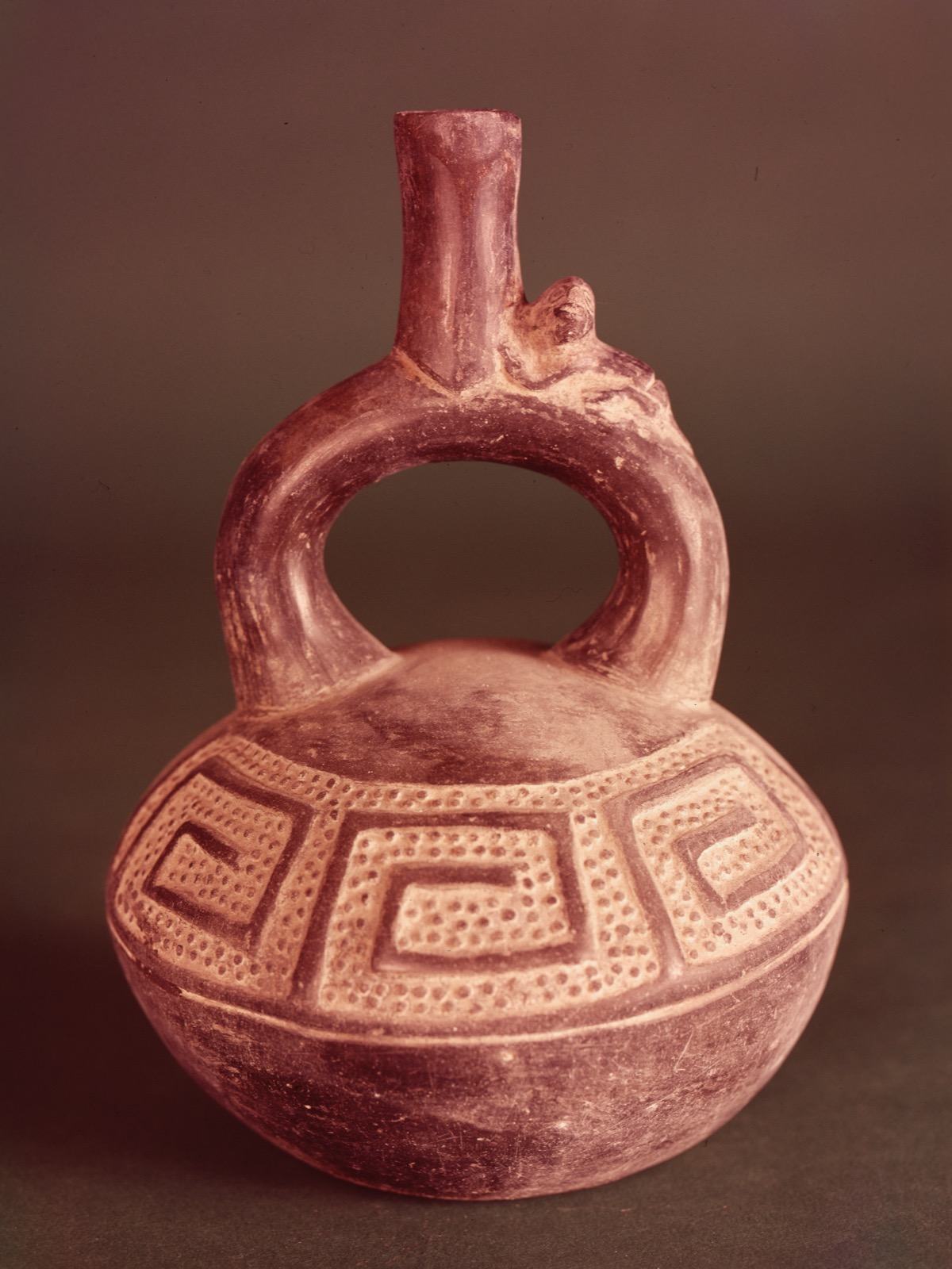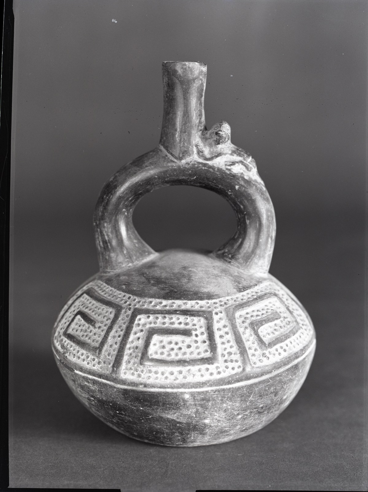 - NOTIZIE STORICO CRITICHE Il vaso fa parte di una collezione precolombiana, pervenuta al Museo di Anatomia Umana "Filippo Civinini" di Pisa tra il 1860 ed il 1870. La collezione fu raccolta in Perù grazie agli scavi effettuati da Carlo Regnoli (1838-1873), medico e studioso dell’Università di Pisa. La raccolta conta 121 vasi delle culture preincaiche Chimù e Chancay, risalenti ad un periodo compreso fra il XII ed il XVI secolo; contengono raffigurazioni antropomorfe, zoomorfe o fitomorfe. Nel 1983 è stata fatta una mostra sulla collezione e in tale occasione è stata fatta una pulitura degli oggetti ed è stato pubblicato il catalogo della mostra: " La collezione di vasi precolombiani dell’Istituto di Anatomia Umana Normale." In questo catalogo si ipotizza che il corpo del vaso in questione sia stato ottenuto con uno stampo orizzontale. Lo stampo era la tecnica di formatura più diffusa, perché consentiva la realizzazione di forme plastiche anche molto elaborate in tempi relativamente brevi. Si prediligeva per i vasi più comuni come questo (con ansa a staffa e collo cilindrico) lo stampo verticale, anche se in questo caso è stato utilizzato quello orizzontale. Il vaso è di colore nero, simile al bucchero, colore che caratterizzava la maggior parte della ceramica Chimù e che veniva ottenuto cuocendo i vasi in atmosfera riducente, ossia povero di ossigeno