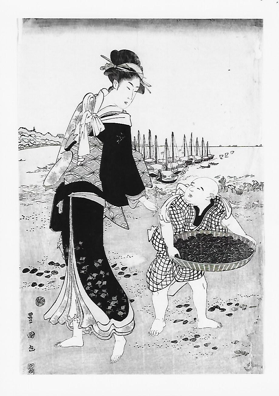 • NOTIZIE STORICO CRITICHE Un bambino tiene un cesto pieno di cozze e a sinistra una donna lo guarda tenendo in mano una pipa. Ha sfilato la manica destra di un kimono esterno e tiene al collo un asciugamano. Sullo sfondo numerose navi sul mare e persone che lavorano sulla spiaggia. Il sigillo di censura kiwame che si trova in questa stampa è stato usato durante due periodi, uno dal 1791 al 1804 e l'altro dal 1815 al 1842. In questo secondo periodo lo stile di Toyokuni, che aveva ormai acquistato una sua indipendenza artistica, non corrisponde a quello della presente opera, che rivela ancora una forte influenza di diversi pittori noti di allora, come Utamaro, Shuncho, ecc. D'altra parte Toyokuni diventò famoso pubblicando una serie di stampe di attori verso il 1794-1796 dall'editore Izumi-ya Ichibee. In questo periodo Toyokuni pubblicò numerose stampe da questo editore fra cui la presente opera