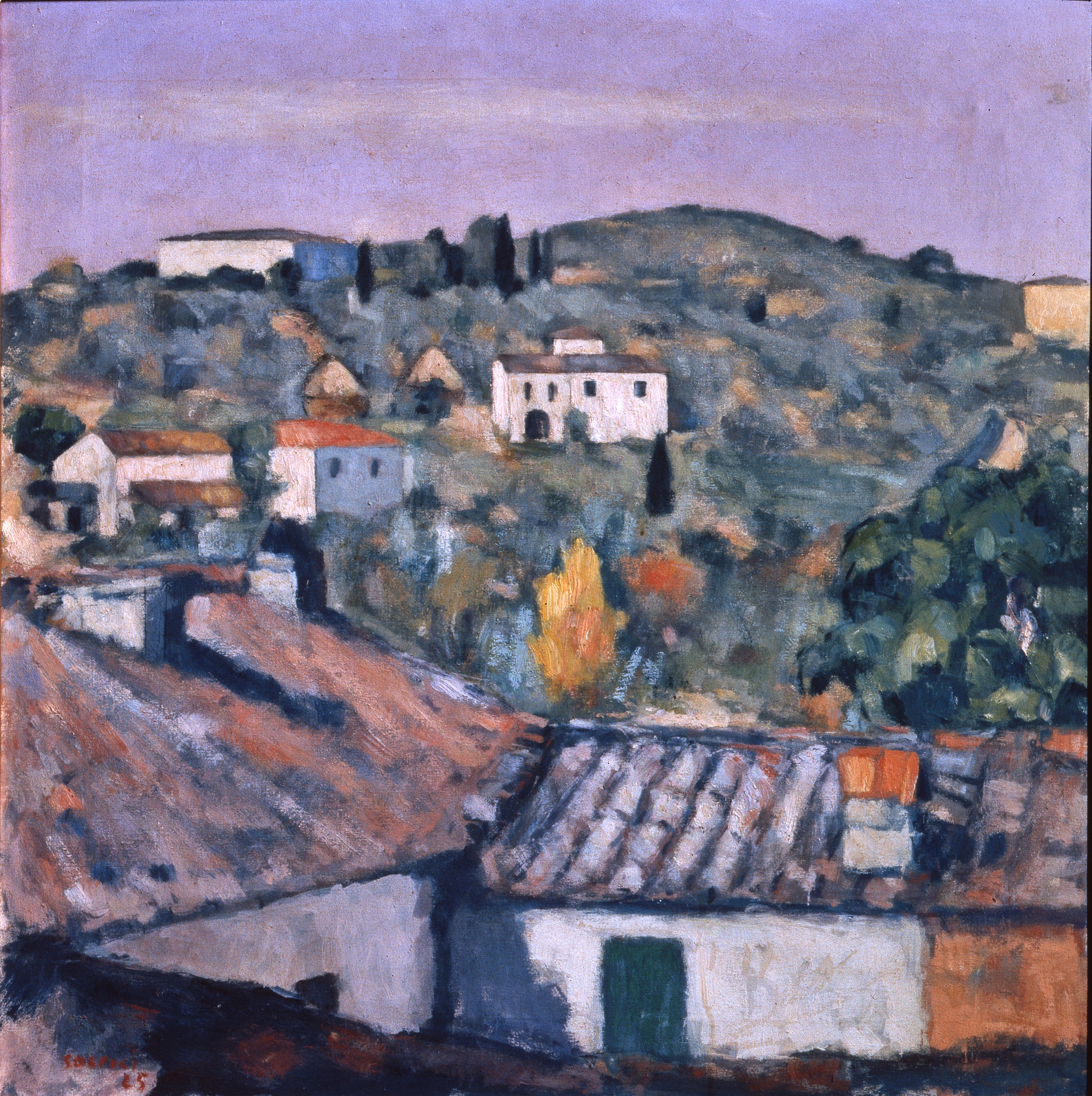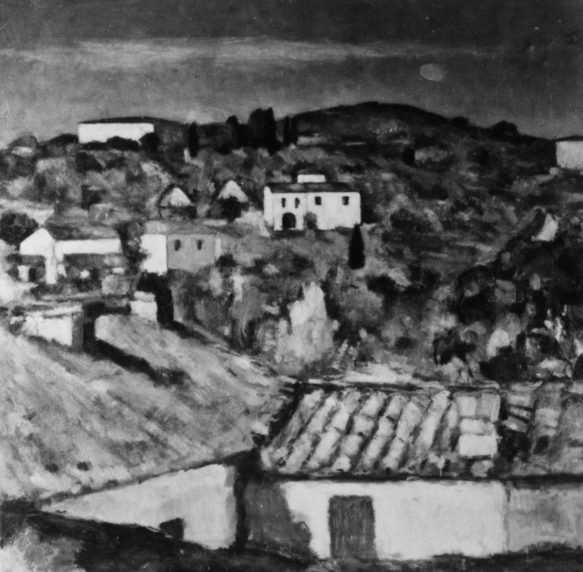 - NOTIZIE STORICO CRITICHE l'incaricati degli acquisti per la Galleria fiorentina alla XV Biennale del 1926 (Ojetti, Pelagatti e Maraini) proponendo un aumento della spesa, la giustificavano con queste parole: "i sottoscriti si sono indotti a tale proposta che comporta una spesa rilevante, a causa della singolarissima importanza assunata nella corrente Biennale...dall'arte toscana. Per l. 60.000 complessive si acquistarono questo paesaggio di Soffici (notandone la "limpida festevolezza paesana"), Gli Apostoli di Carena, un Bacci, un Caligiani e un Tossi: una scelta cioè di "opere di artisti toscani o residenti a Firenze per completare lo sviluppo dell'arte toscana contemporanea" nella raccolta statale. Per quanto concerne la scelta di questo paesaggio, entro la mostra individuale di Soffici, un telegramma di Ojetti e Maraini testimonia che in un primo tempo si era pensato ad un'opera più rappresentativa, La toeletta del bambino (ora della Galleria d'Arte Moderna di Roma), per cui l'autore si rifiutò di diminuire il prezzo non certo moderato di l. 50.000, mentre la disponibilità dei fondi in aprile era complessivamente di l. 40.000, poi aumentate come si è detto della metà. Accanto alla felicità cromatica della descrizione naturale con toni di verde e luci diffuse gialle e aranciate, sotto l'azzurro pieno del cielo, Soffici si interessa a problemi di volumetria nelle forme isolate delle case (con una semplificazione quasi "naive" nel rustico al centro) e sopratutto torna alla costruzione cézanniana nella massa dell'albero sulla destra in secondo piano. La fatica di questa ricerca si avverte nel solido composto dai muri e dai tetti in primo piano, delimitato dai contorni scuri afrangiati e da riprese impastate del colore: quasi una negazione, voluta e pensata, dell'impressione e dell'immediatezza della veduta collinare