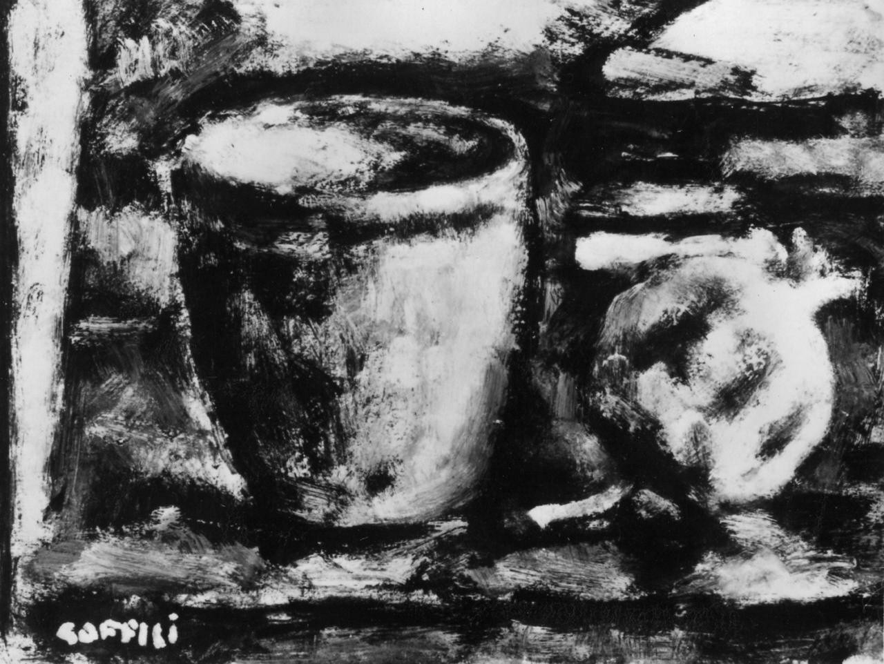 - NOTIZIE STORICO CRITICHE Il bozzetto, esposto a Milano nel 1952 alla Galleria Gianferrari, tre anni dopo, alla VII Quadriennale romana risultava di proprietà dell'editore Vallecchi; non è ricostruibile se fosse giunto in mano dell'editore per acquisto o per dono, così come non è documentato il passaggio nella collezione Ambron. Probabilmente l'ing. Ambron l'acquistò alla Quadriennale, poiché il 13 giugno 1956 aggiungendo 5 opere alla sua seconda donazione alla Galleria fiorentina, la Natura morta di Soffici risultava ancora "temporaneamente alla Quadriennale". La piccola natura morta si fa notare per una certa "sprezzatura" nel segno e nel colore, gettato a rapidi tocchi come sfatti sul cartone, la cui tinta di fondo traspare ai bordi e tra le pennellate. La fusione volumetrica delle pennellate scure di contorno si imposta nel fondo spezzato da note azzurre e bianche, con un effetto di commistione materica. Interessante un'appunto di Soffici a questo proposito (28 marzo 1952): "Fra i critici e i pittori si fa oggi troppo caso della "bella materia" della "bella pittura" e su questo fondamento si giudicano le opere d'arte. Si può invece benissimo immaginare e concepire una "pittura brutta", "malfatta" che sia bella; ma occorre perciò che il pittore sia un grande maestro. Anzi, il rifuggire dalla "bella pittura", dalla "bella materia", dalla "bella pasta", le quali rappresentano in fondo le conservazioni di un tempo, può essere proprio il segno della genialità" (A. Soffici, Opere, Firenze 1963, vol. V, p. 501)