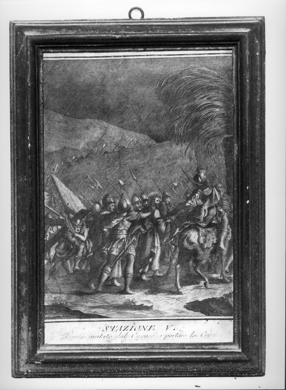 - ISCRIZIONI in basso al centro - Gesù è aiutato dal Cireneo a portare la croce - capitale - a stampa -