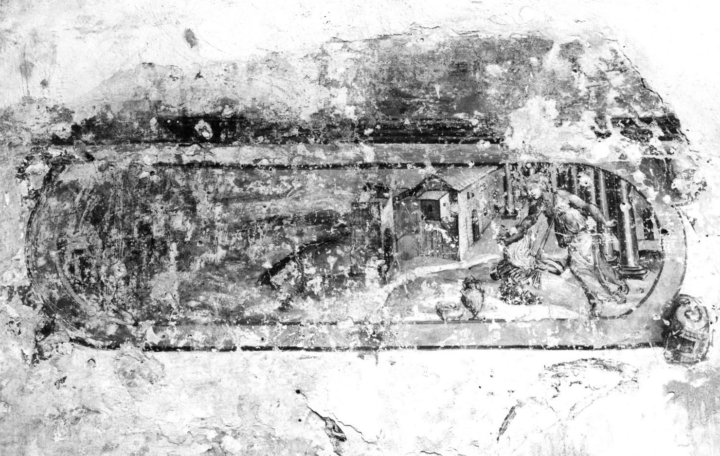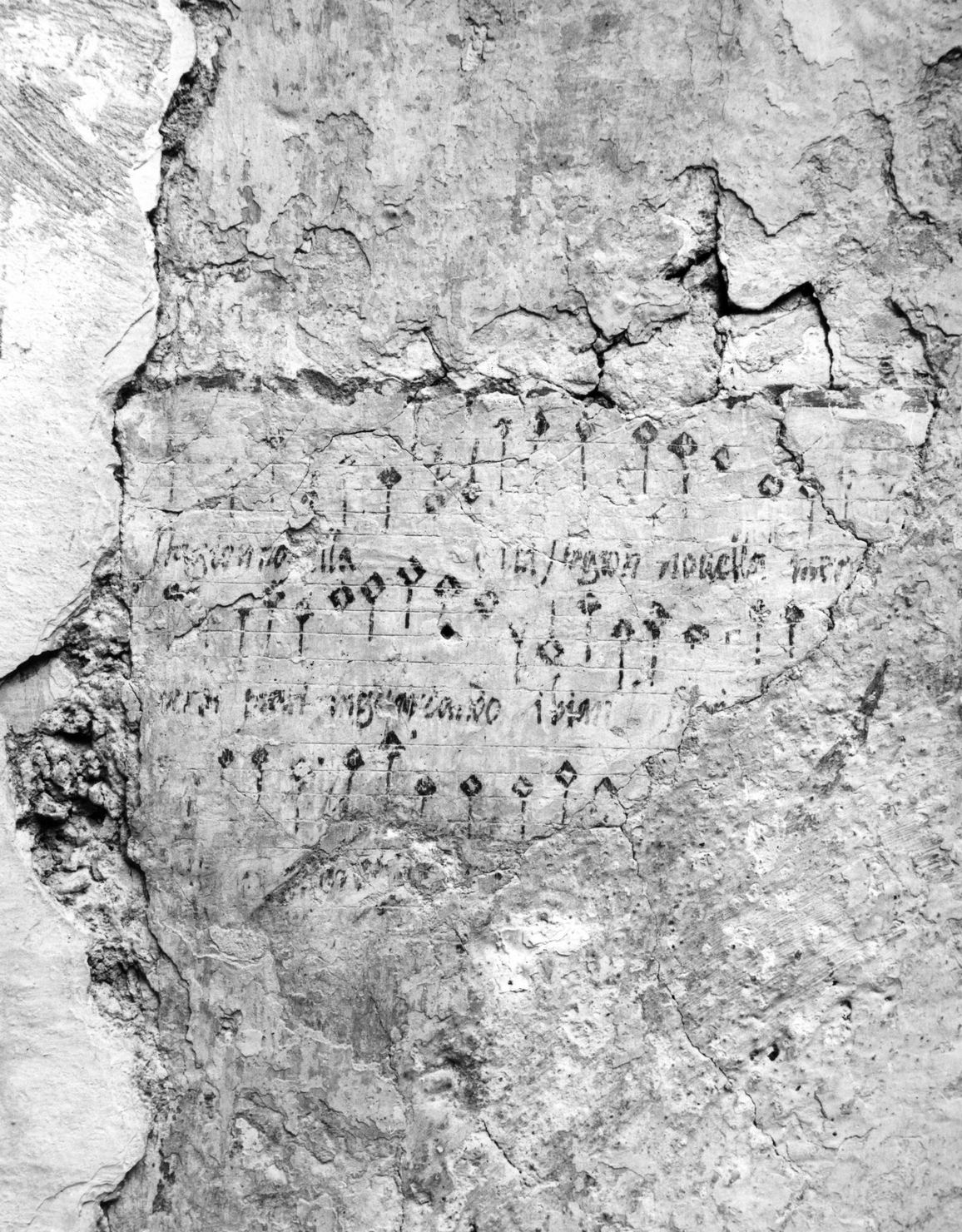 - NOTIZIE STORICO CRITICHE La stanza fu fatta affrescare forse da Niccolò IIII Orsini, il cui nome, assieme allo stemma nobiliare, era tracciato su di una parete della sala ed oggi è scomparso assieme ad altre parti del dipinto. Vicino al nome era scritta anche la data di morte del signore di Sorano, 1510, ciò ci fornisce un termine per datare gli affrreschi e darci un indicazione stilistica, datando l'opera ai primi del '500. L'idea cardine era tipicamente umanistica, realizzare cioè un complesso in cui fossero presenti la pittura, la musica e la poesia; così fu scelto di trascrivere per quattro voci diverse, contralto, baritono, soprano e mezzo soprano, la famosa canzone cantata da Neifile nella nona giornata del Decamerone di Boccaccio