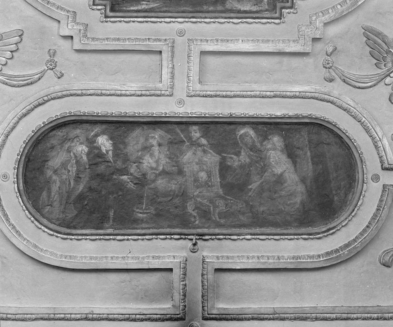 - NOTIZIE STORICO CRITICHE Probabilmente la scena rappresenta uno dei miracoli di resurrezione della Santa, durante la peste a Siena. Come in altri dipinti della campata, ad opera di modesto pittore seicentesco, solamente il volto di Caterina è reso riconoscibile, mentre le altre figure sono accennate; anche la patina scura impedisce di riconoscere le fisionomie delle altre figure: quella sdraiata a mani giunte è forse una donna. Stranamente accurato e databile il panneggio della donna alle spalle della Santa