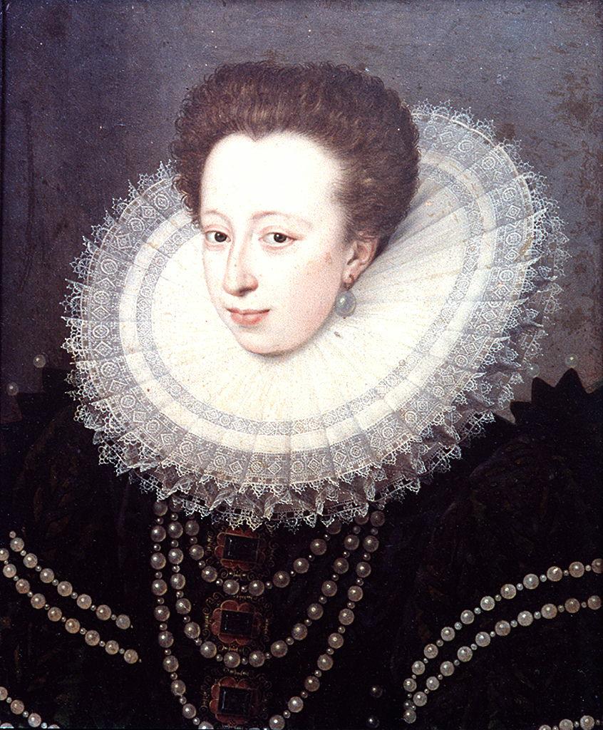 Ritratti: Cristina di Lorena. Abbigliamento: abito; collane di perle; lattuga; orecchini
