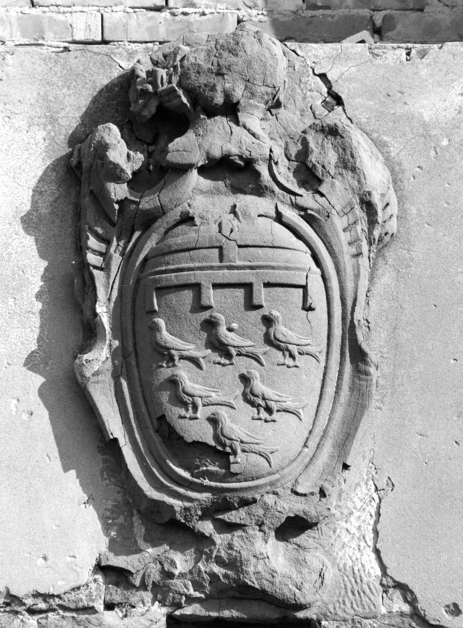 Stemma in pietra grigia, circondato da una cornice sagomata con celata, ornata da piume