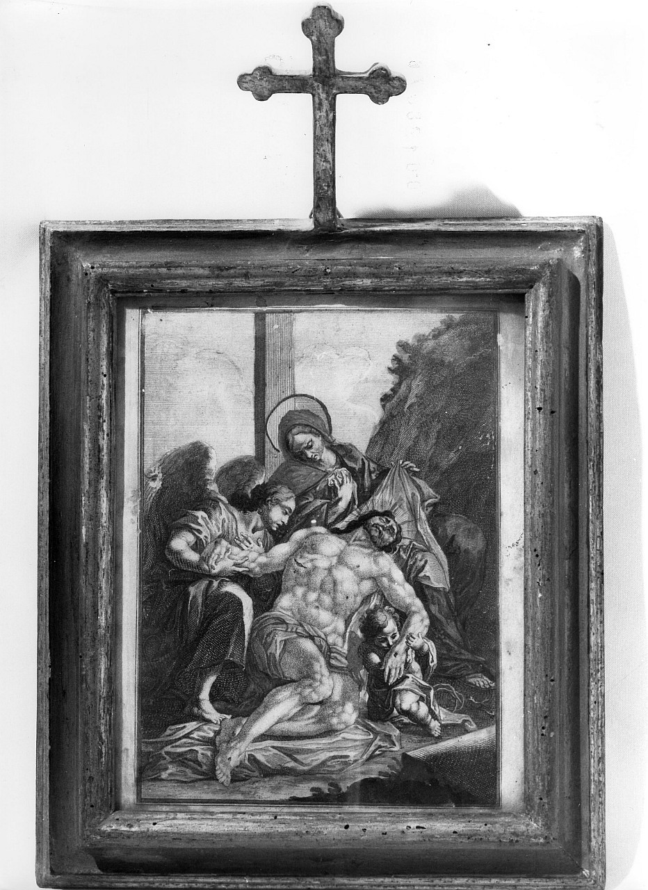 Soggetti sacri. Personaggi: Cristo; Madonna. Figure: angelo; bambino. Abbigliamento: all'antica. Strumenti del martirio: croce. Simboli della passione: corona di spine. Simboli del martirio: fori dei chiodi. Oggetti: lenzuolo. Vegetali: ciuffi d'erba. Paesaggi: Golgota