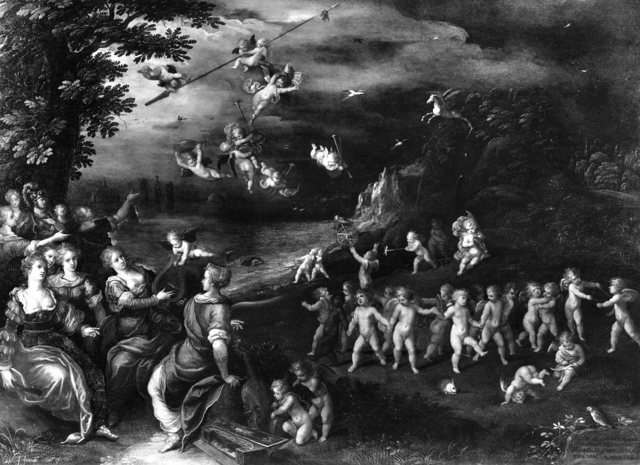 - NOTIZIE STORICO CRITICHE Passata agli Uffizi, proveniente da Palazzo Pitti, il 12 maggio 1796 (Gior nale, 1784-1825, c. 57, n. 5460); Inv.1784,n. 757; Inv.1825,n. 953. Passat o dagli Uffizi alla Galleria Palatina nel 1928. A sinistra le nove Muse ci rcondano minerva con l'elmo. Verso destra nel cielo alcuni angeli giocano con gli attributi delle muse come la sfera armillare, attribuito di Urania . A destra, Pegaso spicca il volo dal Parnaso; verso sinistra un paesaggio con una baia e una città. A. Pompe de Hirimonde, che non conosceva l'iscr izione, spiegando il significato dell'opera ebbe a notare il carattere iro nico e lo interpretò come una scena preparatoria per un concerto delle Mus e. Si deve al Manteuffel la datazione del dipinto al 1610 circa, da noi co ndivisa
