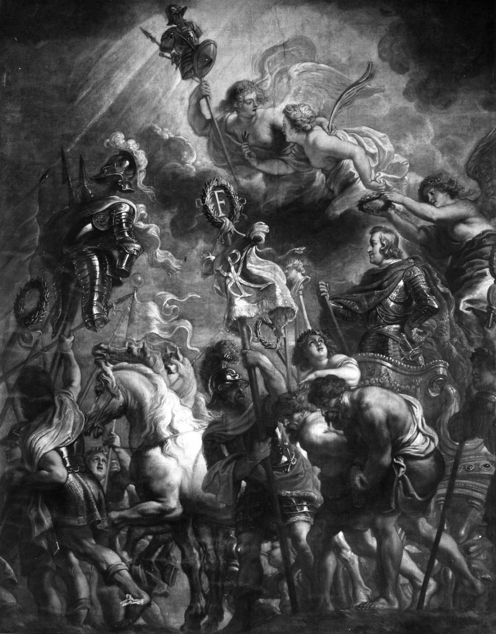 - NOTIZIE STORICO CRITICHE Appartenuto al cardinale infante Ferdinando; comprato ad Anversa dal cavaliere Venier, ambasciatore della Serenissima a Parigi verso il 1710; comprato a Venezia verso il 1770 da John Udny, console d'Inghilterra a Livorno; da lui rivenduto alla Galleria reale di Firenze nel 1791 per 400 zecchini (sulla storia del dipinto, vedere i documenti pubblicati qui sotto: ASG, Filza XXIX, 1791, n. 37); restaurato nel 1792 da Gesualdo Ferri (ASG, Filza XXV, 1792, n. 2); questo documento del 22 novembre indica che il dipinto è stuccato tutt'intorno al telaio. Posto nella Sala della Niobe (Giornale, 1784-1825, c. 30 v). Fu riconosciuto copia nel XIX secolo. L'inv. 1825, n. 946, lo descrive in questo modo: "Da Rubens. La dicontro tela di n. 946 è stata arrotolata nel rullo n. 2, posto nello stanzino KK detto delle copie, corridoio del Pal. Pitti." Il 13 novembre 1634 le autorità municipali di Anversa decisero di organizzare in onore dell'infante Ferdinando di Spagna, fratello cadetto del re Filippo IV chiamato a succedere all'infanta Clara Eugenia, morta nel 1633, come governatore dei Paesi Bassi spagnoli, un ingresso solenne nella città, che avvenne il 17 aprile 1635. La direzione materiale della festa, la più importante tenutasi ad Anversa nel corso del XVII secolo, fu affidata a Pietro Paolo Rubens, il quale eseguì i bozzetti e i tre dipinti per l'Arco di Benvenuto. La realizzazione dei bozzetti di Rubens fu affidata ad un gruppo di artisti di Anversa. L'ingresso solenne di Ferdinando decorava la parte centrale del rovescio dell'Arco di trionfo. Il bozzetto originale di Rubens è conservato all'Ermitage di San Pietroburgo (n. 504). L'esecuzione fu affidata, con contratto del 28 novembre 1634, a Jan van den Hoecke; l'opera come oggi si presenta fu probabilmente ritoccata da Jacob Jordaens. Ne esiste un'incisione di Theodor van Thulden. La scena del trionfo presenta chiari ricordi dell'antico, basati soprattutto sul bassorilievo dell'Arco di Tito. Riteniamo utile riprodurre gli estratti più importanti dei documenti d'acquisto del dipinto da parte della Galleria Reale di Firenze (ASG, Filza XXIV, 1791, n. 37). In una lettera del 16 giugno 1791, John Udny, console d'Inghilterra a Livorno, mandata da Pisa al direttore della Galleria Pelli Bencivenni, scrive a proposito di tre dipinti attribuiti a Rubens: "Questi (quadri) furono da me comprati venti anni sono dalla nobil famiglia Venier in Venezia (...)". Il 16 giugno 1791 Pelli Bencivenni scriveva il seguente rapporto "relativo a tre quadri coloriti dal Rubens offerti sino dall'anno scorso in vendita per questa Real Galleria dal Console generale britannico in Livorno Giovanni Udny (...) Fra i medesimi quello solo dell'Ingresso trionfale in Anversa del Cardinale Infante di Spagna parve degno di essere riposto in questo luogo, ma come poi l'affare cadesse non mi è noto (...)"