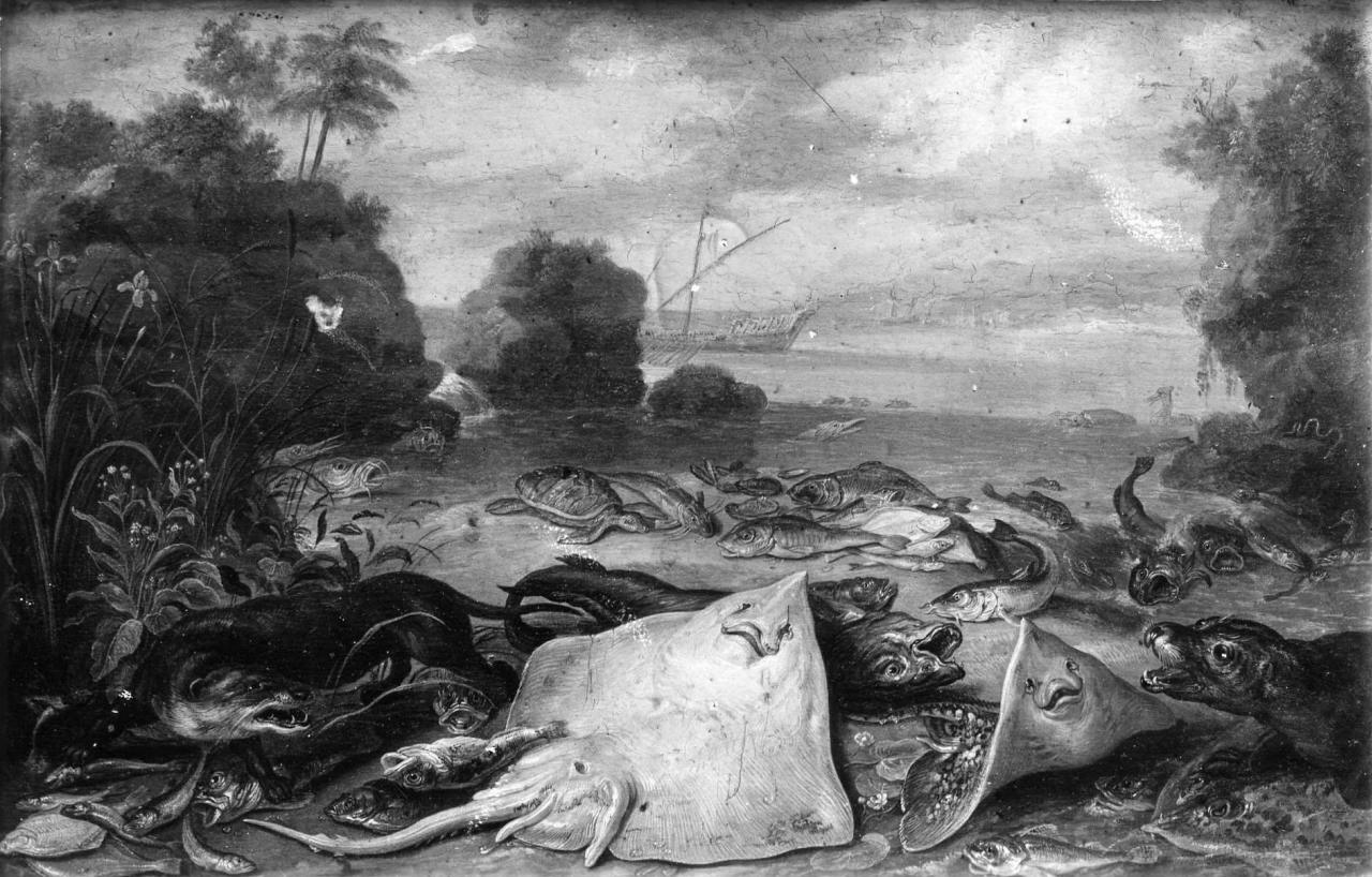 - NOTIZIE STORICO CRITICHE E' forse uno dei tre rami di Van Kassel comprati nol 1667 ad Anversa da Co simo III (G. J. Hoogewerff, 1920, pp. 117-124); collezione di Anna Maria L uisa de' Medici Elettrice Palatina; inv. 1753, n. 492; inv. 1769, n.750. S econdo il resoconto di C. Prie (1668, c. l60v; H. Geisenheimer, 1911, p. 3 9). Cosimo III de' Medici, recatosi ad Anversa il 30 gennaio 1668 "si port ò a vedere diverse pitture nella casa del Vanchesser Pittore dove vedde le quattro parti del Mondo, con la prospettiva delle città principali e con le figure d'animali d'ogni sorte che si producono in quelle parti distinta mente. Egli conformava cosi il proprio gusto per le curiosità del quale av eva dato già prova ad Amsterdam, acquistando dipinti di Otto Marseus e di Willem van Aelst e portando con sé il ritagliatore di profili Jan van Ache lom. Abbiamo ancora oggi due serie complete delle parti dal monda. Una si trova all'Alte Pinakothek di Monaco di Baviera, n. 1910-1913, e consta di quattro grandi tavole che presentano nella parta centrale una raffigurazio ne allegorica di ciascuna parte dal mondo, circondata da sedici piccoli ra mi sinboleggianti ciascuno una città, con in primo piano animali. Una seco nda tavola composta di quattro rami, si trova al Prado (M. Diaz Padron, I, 1975, pp.169-171 n. 1554).Cosimo III ebbe l'occasiona di vedere l'una o 1'altra di questa curiose composizioni in quanto l'Allegoria dell'Europa d i Monaca è datata 1664 e la serie di Madrid 1660. I pesci di Firenze si st agliano sulla riva di una costa del Mediterraneo, in secondo piano si scor ge una galera. La lontra in primo piano a sinistra compare anche nella Ved uta di Copenhagen di Monaco, mentre la composizione con una Marina sullo s fondo compare nelle due Nature morte con pasci e conchiglie. (Madrid, Prad o, cfr. M. Diaz Pedron, I, p. 172, 1975). L' esemplare di Firenze con le razze in primo piano, le piante acquatiche a sinistra, è uno dei migliori della produzione del van Kassel, come ha rivelato la pulitura