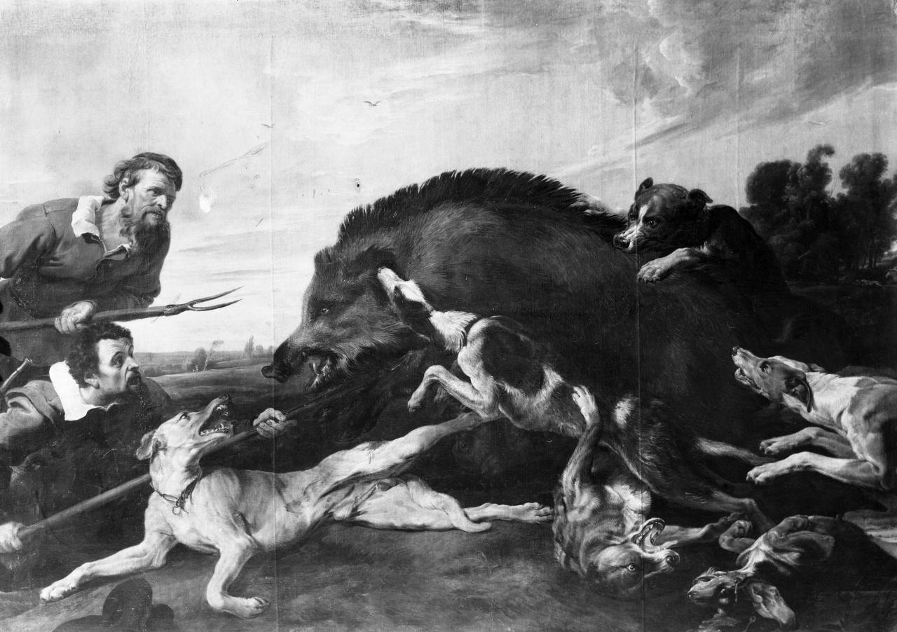 - NOTIZIE STORICO CRITICHE Proviene da Praga, 1737; Galleria di Vienna ( C. von Mechel, 1783, p. 194, n. 50 ); passato alla Galleria degli Uffizi nel 1821, a seguito dell'acco rdo di scambio del 1792, sospeso parzialmente durante il periodo rivoluzio nario ( A.S.G., Filza XLIV, 1820, n. 12; XLV, 1821, n.18; Giornale, 1784-1 825, c. 199v: dalla imperiale Galleria di Vienna addì 24 aprile 1821. Altr o quadro di Francesco Snyders, la "Caccia al cinghiale"... tela, alto b. 3 .1518, largo d. 5.7 sala di Niobé ); inv. 1825, n. 2322, la "Caccia al cin ghiale" è un'opera tipica di Frans Snyders della quale esistono altre vers ioni, come quella della Galleria Nazionale d'arte antica di Roma. La compo sizione deriva nelle parti essenziali dalle Cacce al cinghiale di Rubens, per lo quali lo Snyders dipinse le parti con animali. Dalla Caccia al cing hiale di Marsiglia deriva l'espressione dello sforzo del bracchiere a sini stra e il combattimento feroce tra il cinghiale e il cane; dalla Caccia di Dresda, invece, l'altro bracchiere e il cane ferito a destra. La Caccia a l cinghiale caledonio di Vienna è piuttosto diversa. Snyders ha lasciato a lcui disegni per le sue cacce al cinghiale, come quello per la Caccia di M eleandro del British Museum a Londra e l'altro per una Caccia al cinghiale dell'Albertina di Vienna ( Ch. Bordley, 1956, fig. 29 ). Esiste un disegn o per un cane ferito in primo piano a sinistra, oggi al Cooper Hewitt Muse um di New York ( Id., p.28 ). Il cane è ripreso rovesciato in un'altra Cac cia al cinghiale del Museo del Pardo, n. 1749 ( M. Diaz Padron, I, p. 362 ), esemplare più modesto, a nostro parere, di quello di Firenze