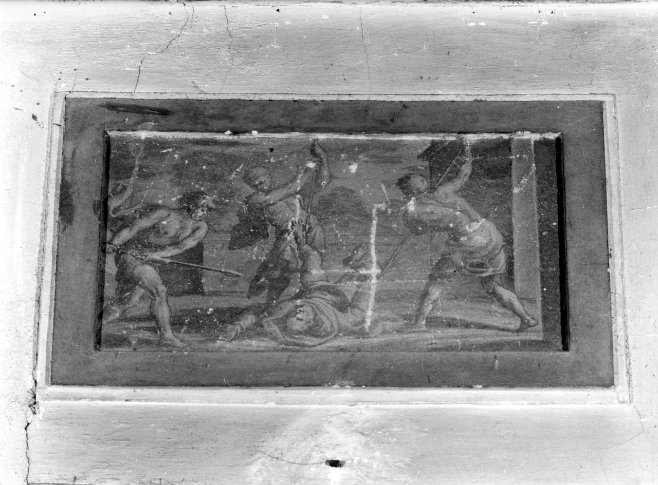 - NOTIZIE STORICO CRITICHE Ciclo raffigurante una serie di scene di martiro di santi , ciacuna collocata rispettivamente sopra il santo a cui si riferisce il sacrificio. Il modo di schizzare in monocromo, veloce e disinvolto, quasi da bozzetto, ben si confà allo stile del Puglieschi, autore, a nostro parere, di tutto il decoro settecentesco della navata, vedi la scheda 0900129964. Questi monocromi sono molto vicini ai medaglioni, anch'essi a monocromo, con " Storie dei santi Fondatori" nella cappella della Confraternita di san luca, nel chiostrino dei morti della SS. Annunziata di Firenze, anch'essi opera del Puglieschi
