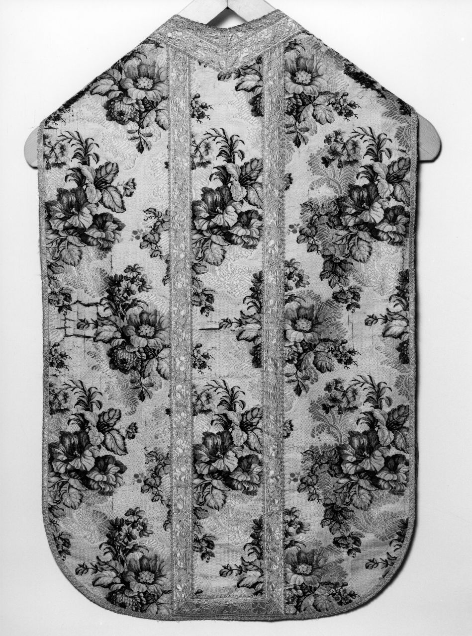 Pianeta con fondo bianco e trame di lanciato in verde e marrone, e varie spolinature nei colori rosa, viola, rosso, blu; e broccato in oro che formano un motivo a mazzi di fiori disposti in linee diagonali. Il gallone è un'integrazione recente