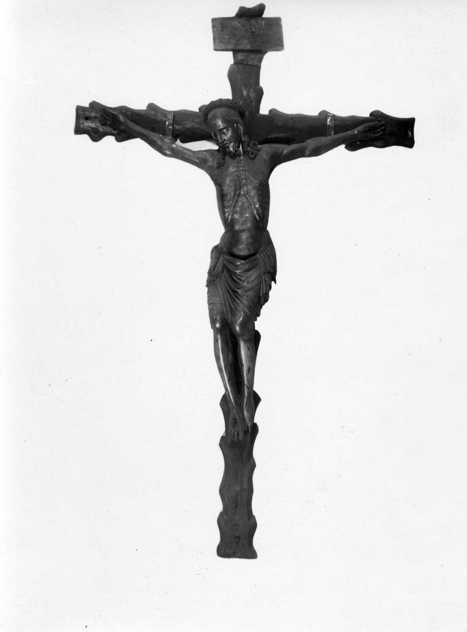 - NOTIZIE STORICO CRITICHE Il crocifisso si trovava sull'altare maggiore, e fu trasferito in questa posizione nel 1622 da fra' Francesco dell'Antella. L'opera si può avvicinare ad un gruppo di crocifissi lignei che fa capo a quello del Museo dello Spedale degli Innocenti, e di cui fanno parte i crocifissi della SS. Annunziata di Arezzo, e dell'Ospedale di Prato. In comune presentano il busto scarno con le costole in evidenza, il ventre gonfio, i fianchi larghi, il panneggio ricco del perizoma che copre il ginocchio sinistro lasciando libero il destro. Inoltre, come quello di Arezzo, ha la croce a forma di tronco d'albero. Si può datare ai primi anni del XV secolo