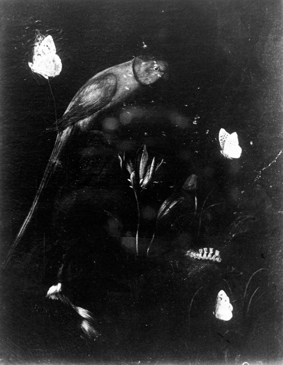 Animali: pappagallo verde; farfalle gialle; bruco; uccello. Fiori: crochi. Piante. Frutti: funghi
