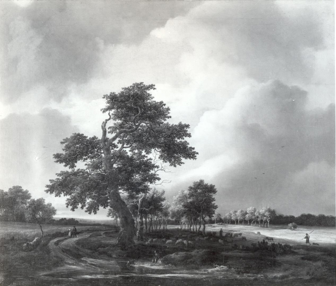 Paesaggi: pianura; cielo nuvoloso. Piante: quercia; alberi. Figure: viandanti; pastori. Animali: pecore; cani