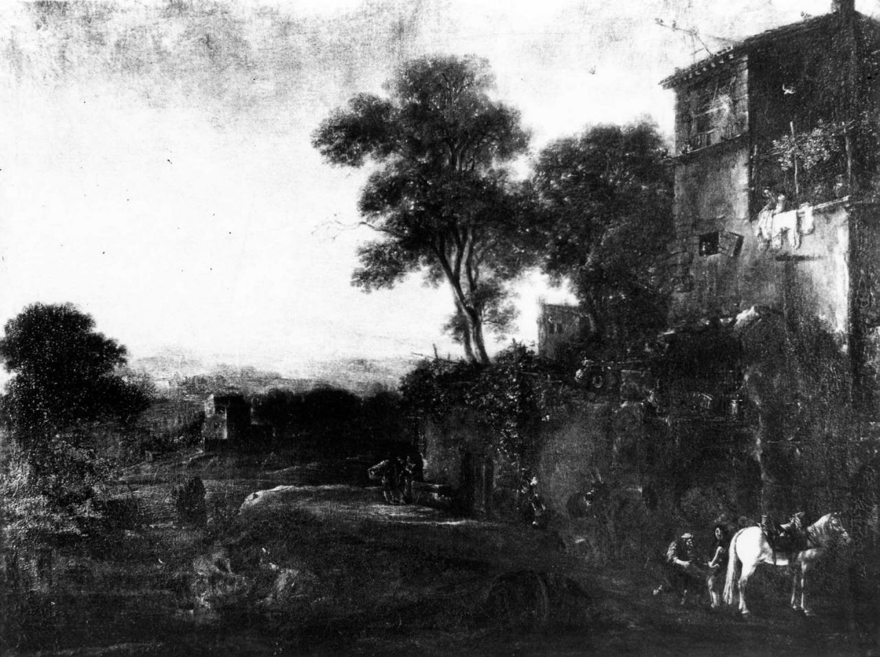 - NOTIZIE STORICO CRITICHE Ha subito un'antica pulitura che lo ha svelato completamente. Leggermente pulita e verniciata nel 1963. Cornice del secolo XVII. L'attribuzione allo Swanevelt, con nella quale appare negli inventari della Palatina, è senz'a ltro da scartare. Tuttavia nel paesaggio- purtroppo molto rovinato da un'a ntica, drastica pulitura- compaiono i caratteristici toni dorati dello Swanevelt, mentre nelle figure e da ravvisare piuttosto l'ascendente del Van Laer e del Cerquozzi: tutti elementi che, assieme con la grandiosa imposta zione compositiva e spaziale, sembrano indicare l'Asselijn. Sottigliezze t onali e luministiche di taluni paesaggi (vedi gli oggetti sul davanzale de lla finestra, l'attenzione con cui sono dipinte le vecchie pietre screpola te) vengono ad appoggiare questa ipotesi. È probabile che si tratti di un quadro dipinto durante il soggiorno romano
