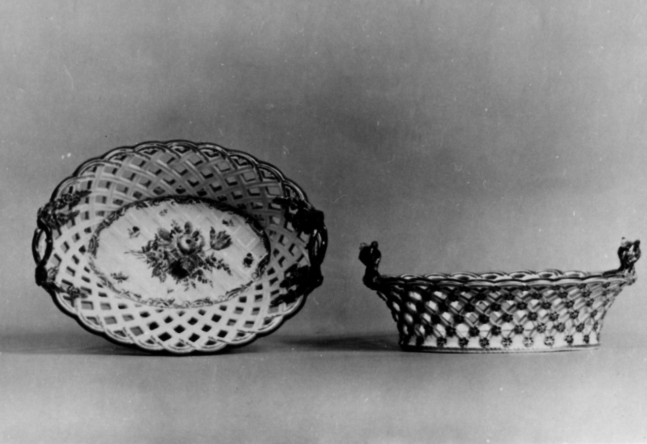 - NOTIZIE STORICO CRITICHE Paniere a traforo fondo bianco con manici a forma di tralci in blu e oro ha all'esterno il bordo decorato a tralci dorati, mentre l’interno è arricchito da un mazzo di fiori variopinti e fiorellini sparsi. Queste paniere che dal 1794 in poi sono state elencate insieme al servizio da tavola di Pietro Leopoldo d’Asburgo Lorena (inv. nn. 710-726) sono analoghe a certe soluzioni della manifattura di Meissen (cfr. F. Hofmann, “Das Porzellan”, Berlin 1932, tav. XXIV), dove a partire dalla metà del secolo trionfò il motivo degli intrecci di vimini e di traforo, motivo trovato frequentemente anche nelle porcellane francesi di quest'epoca
